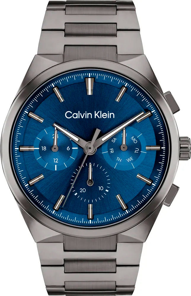 Стильный минимализм этого аксессуара великолепно завершит ваш повседневный образ. Мужские часы с круглым стальным корпусом. 12-ти и 24-х часовой формат времени. Дата и день недели вынесены на отдельные циферблаты. Циферблат с метками в виде штрихов. Рифленая заводная головка. Стальной браслет с раскладывающейся застежкой.