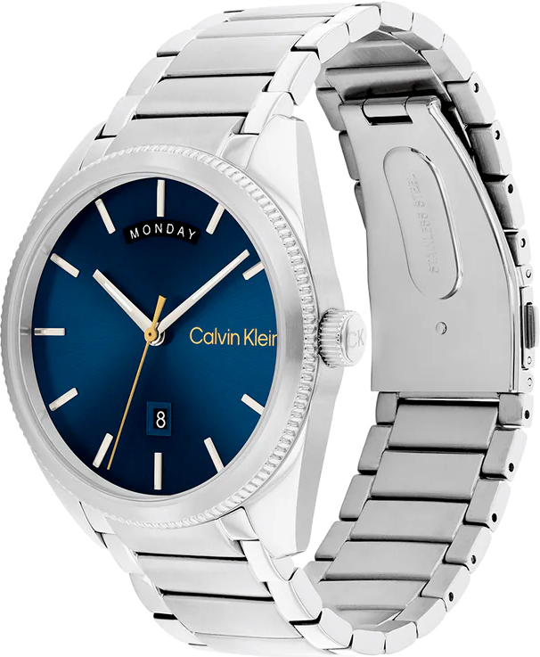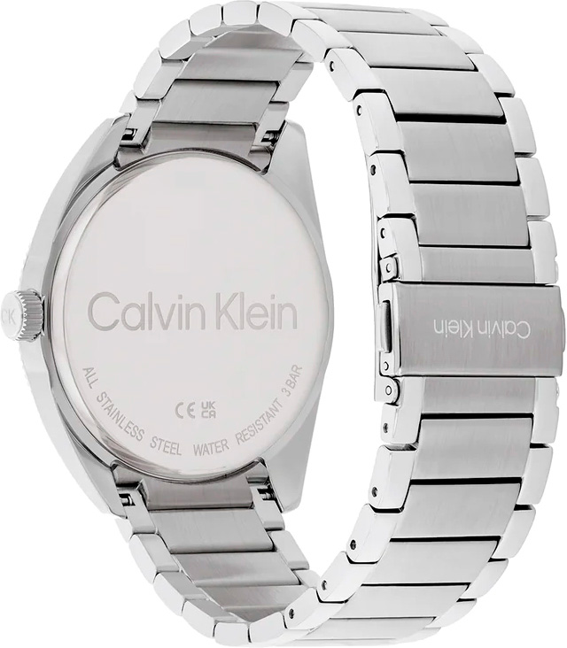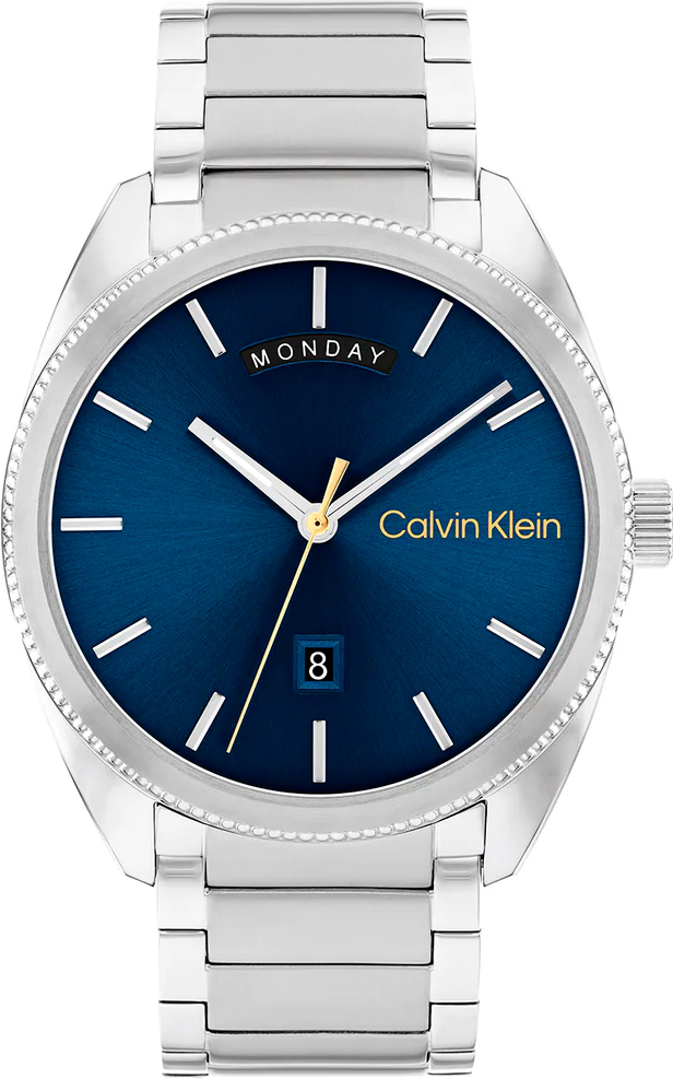 Элегантные и функциональные часы великолепно отражают характер, статус и безупречный стиль своего владельца. Мужские кварцевые часы. Корпус круглой формы из нержавеющей стали. Рифленый безель. Циферблат выполнен по технологии Sunray (солнечные лучи), украшен фирменным логотипом Calvin Klein в положении 3 часа и защищен минеральным стеклом. Метки в виде штрихов. Окошко даты находится в положении 6 часов. Окошко дня недели находится в положении 12 часов. Рифленая заводная головка украшена логотипом ''CK''. Надежный стальной браслет с раскладывающейся застежкой с двумя кнопками и логотипом бренда Calvin Klein.