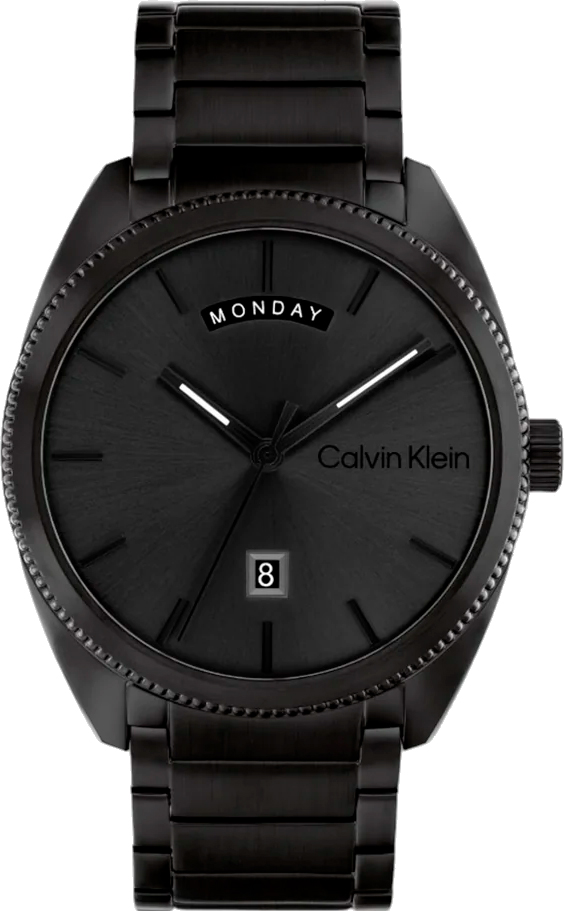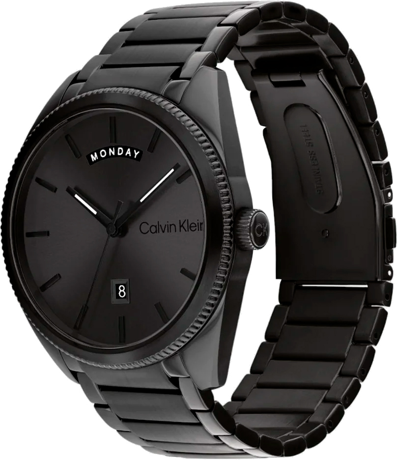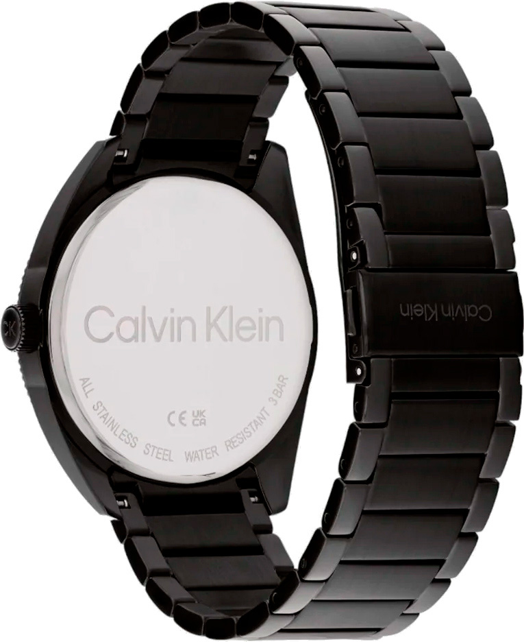 Элегантные и функциональные часы великолепно отражают характер, статус и безупречный стиль своего владельца. Мужские кварцевые часы. Корпус круглой формы из нержавеющей стали с черным IP покрытием. Рифленый безель. Циферблат выполнен по технологии Sunray (солнечные лучи), украшен фирменным логотипом Calvin Klein в положении 3 часа и защищен минеральным стеклом. Метки в виде штрихов. Окошко даты находится в положении 6 часов. Окошко дня недели находится в положении 12 часов. Рифленая заводная головка украшена логотипом ''CK''. Надежный стальной браслет с черным IP покрытием и раскладывающейся застежкой с двумя кнопками и логотипом бренда Calvin Klein.