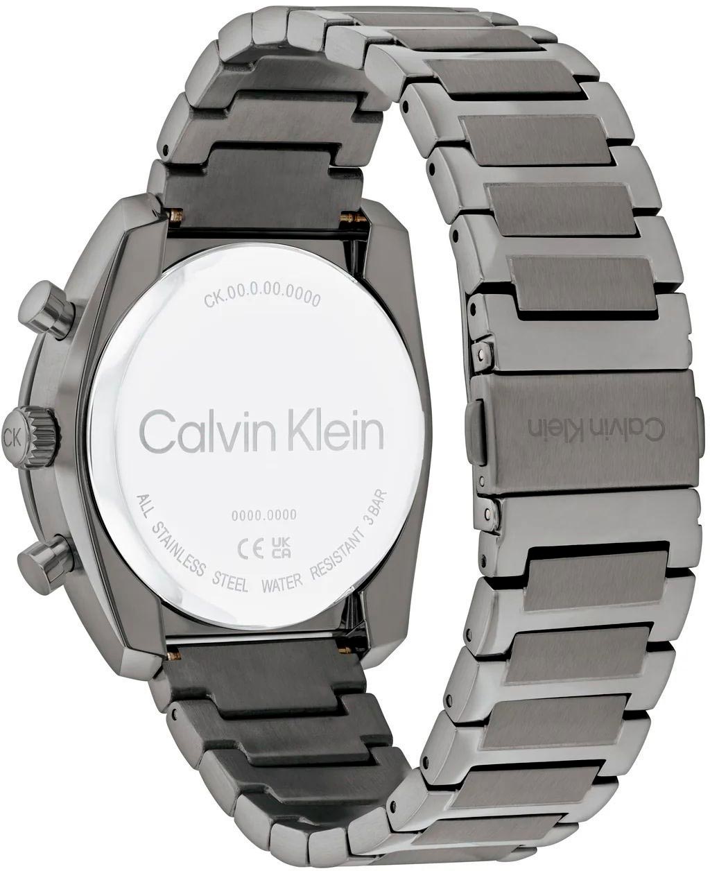 Циферблат с радиальным узором, создающим эффект глубины выполнен по технологии Sunray (солнечные лучи) и украшен фирменным логотипом Calvin Klein.