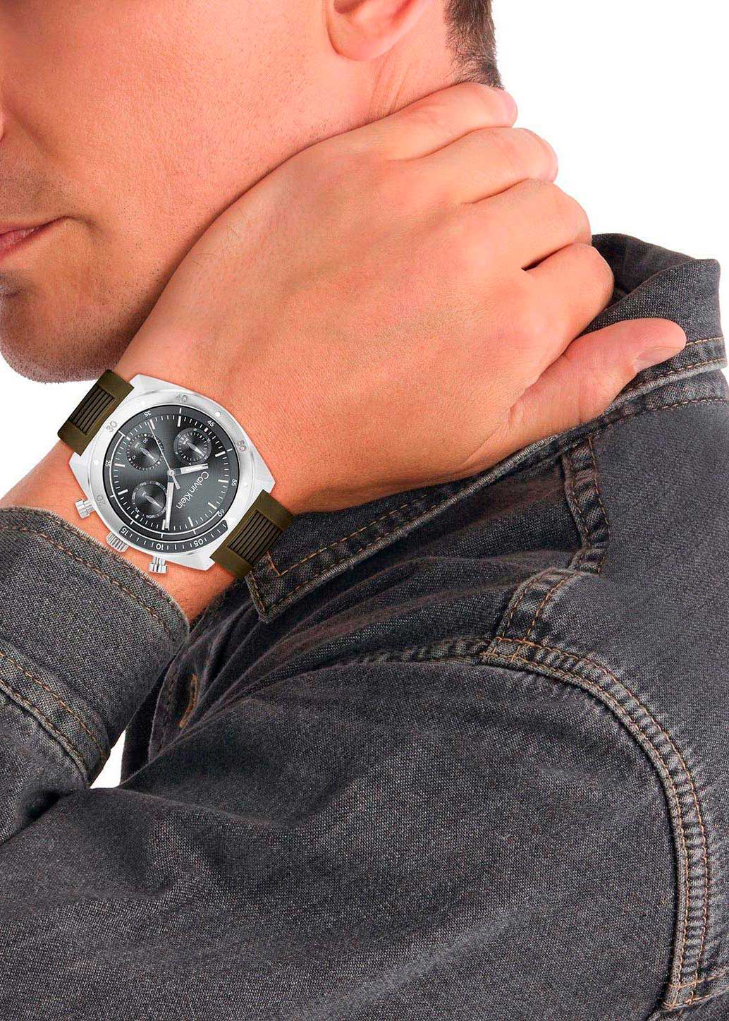 Многофункциональные мужские кварцевые часы. Круглый стальной корпус с матовой и полированной отделкой. Безель с минутной шкалой дополнен белыми метками для лучшей читаемости.