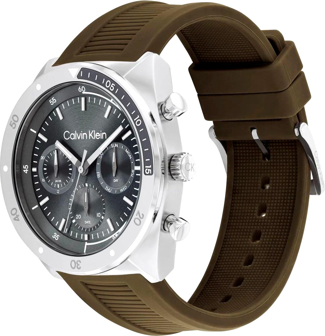 Циферблат с радиальным узором, создающим эффект глубины выполнен по технологии Sunray (солнечные лучи) и украшен фирменным логотипом Calvin Klein.