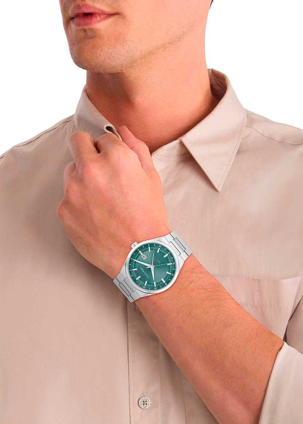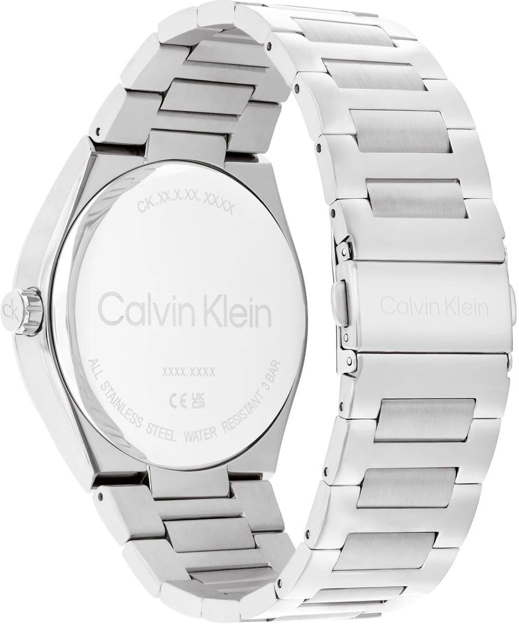 Мужские кварцевые часы. Круглый стальной корпус с матовой и полированной отделкой. Двухуровневый циферблат выполнен по технологии Sunray (солнечные лучи) и украшен фирменным логотипом Calvin Klein.
