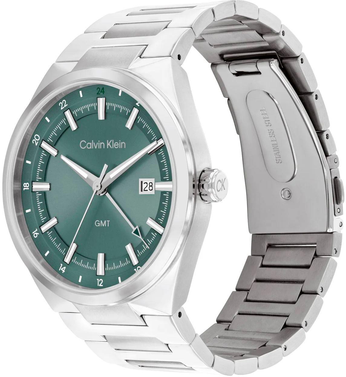 Второй часовой пояс в 24-х часовом формате времени отображается центральной стрелкой. Окошко даты находится в положении 3 часа. Рифленая заводная головка украшена логотипом ''CK''.