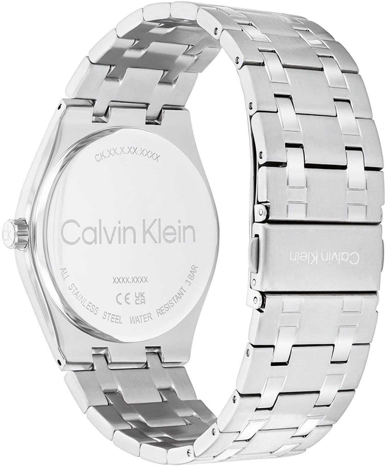 Дата, день недели вынесены на отдельные циферблаты. 12-ти и 24-х часовой формат времени. Рифленая заводная головка украшена логотипом ''CK''. Надежный стальной браслет с матовой и полированной отделкой.