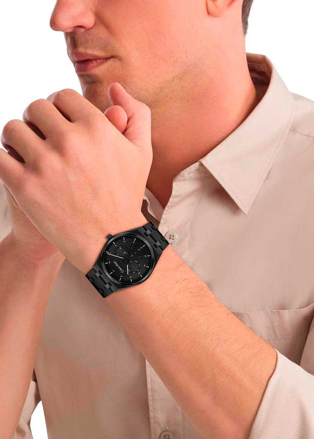 Дата, день недели вынесены на отдельные циферблаты. 12-ти и 24-х часовой формат времени. Рифленая заводная головка украшена логотипом ''CK''. Надежный стальной браслет с матовой и полированной отделкой.