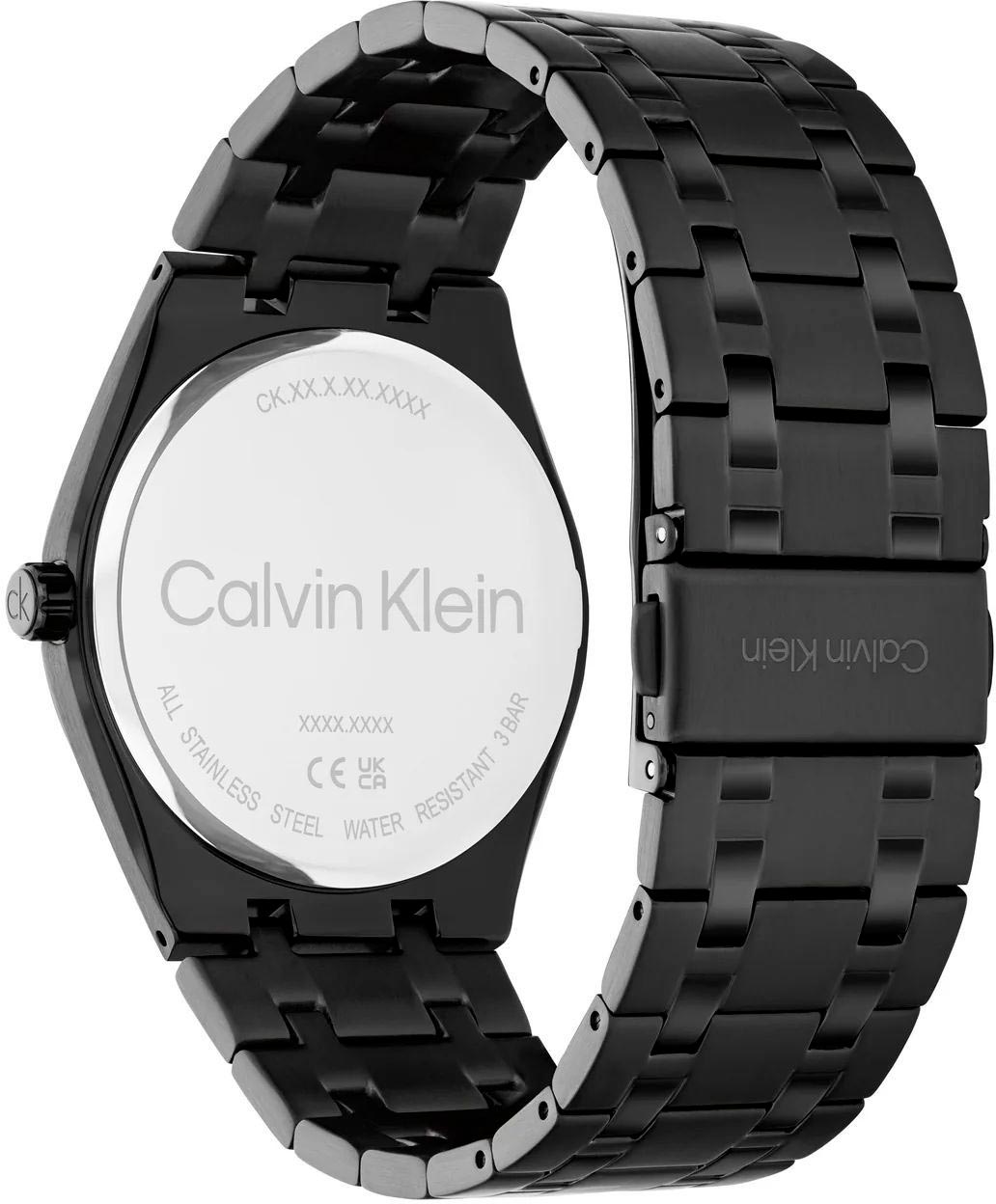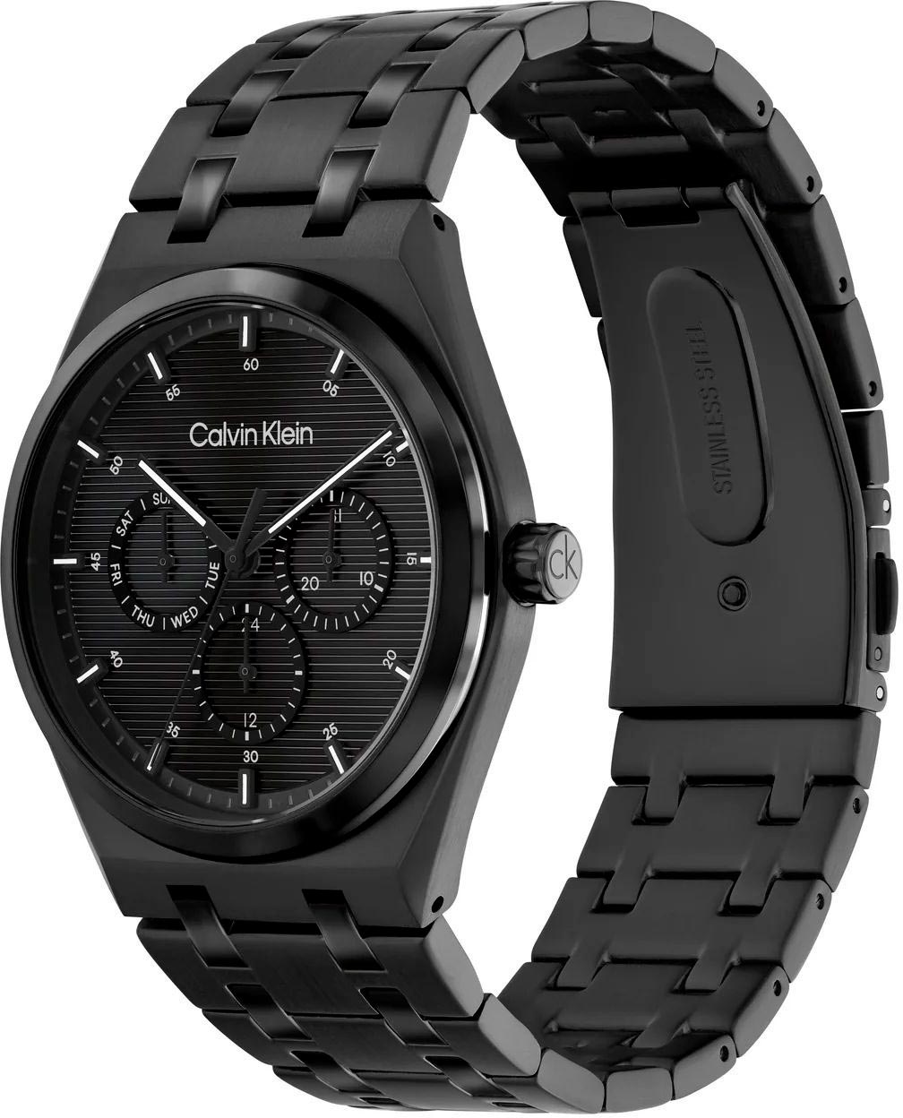 Мужские функциональные кварцевые часы. Круглый стальной корпус с матовой и полированной отделкой. Циферблат с узором из тонких горизонтальных линий выполнен по технологии Sunray (солнечные лучи) и украшен фирменным логотипом Calvin Klein.