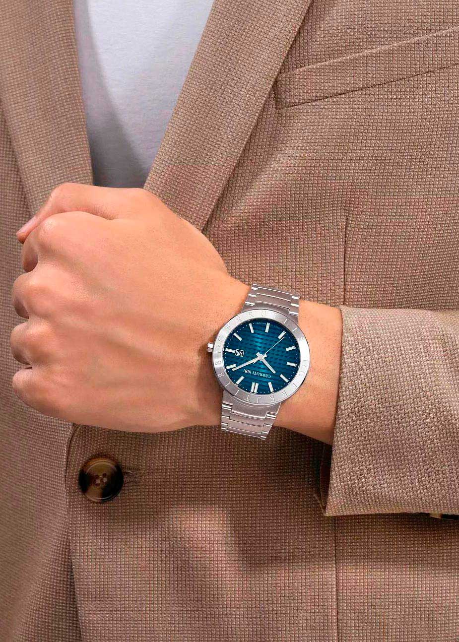 Прямоугольные стрелки в стиле Baton. Метки и стрелки с люминесцентным покрытием, которое светится в темноте после непродолжительной зарядки на свету. Окошко даты находится в положении 3 часа. Заводная головка в виде болта. Надежный стальной браслет с вертикальной матовой и полированной отделкой. Раскладывающаяся застежка.