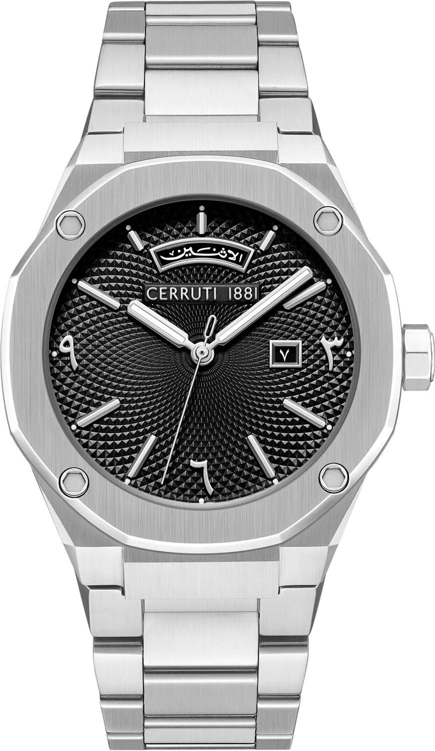 Прямоугольные стрелки в стиле Baton. Метки и стрелки с люминесцентным покрытием, которое светится в темноте после непродолжительной зарядки на свету. Окошко даты находится в положении 3 часа. Окошко дня недели находится в положении 12 часов. Заводная головка в виде болта. Надежный стальной браслет с раскладывающейся застежкой.