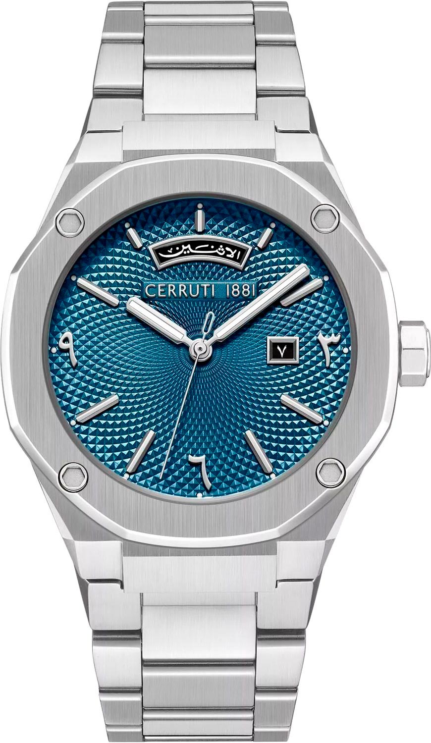Прямоугольные стрелки в стиле Baton. Метки и стрелки с люминесцентным покрытием, которое светится в темноте после непродолжительной зарядки на свету. Окошко даты находится в положении 3 часа. Окошко дня недели находится в положении 12 часов. Заводная головка в виде болта. Надежный стальной браслет с раскладывающейся застежкой.