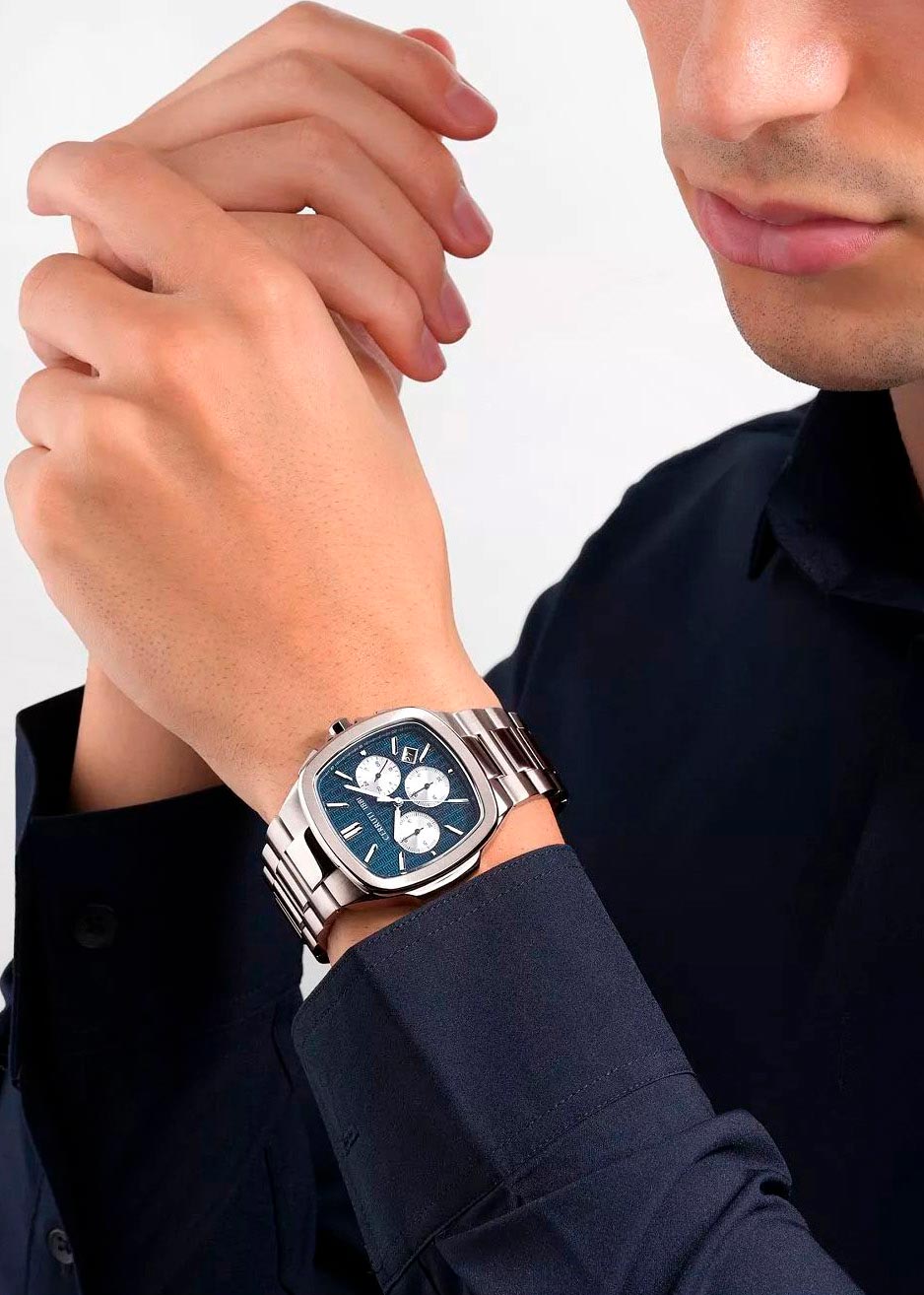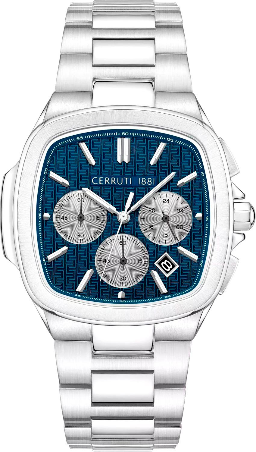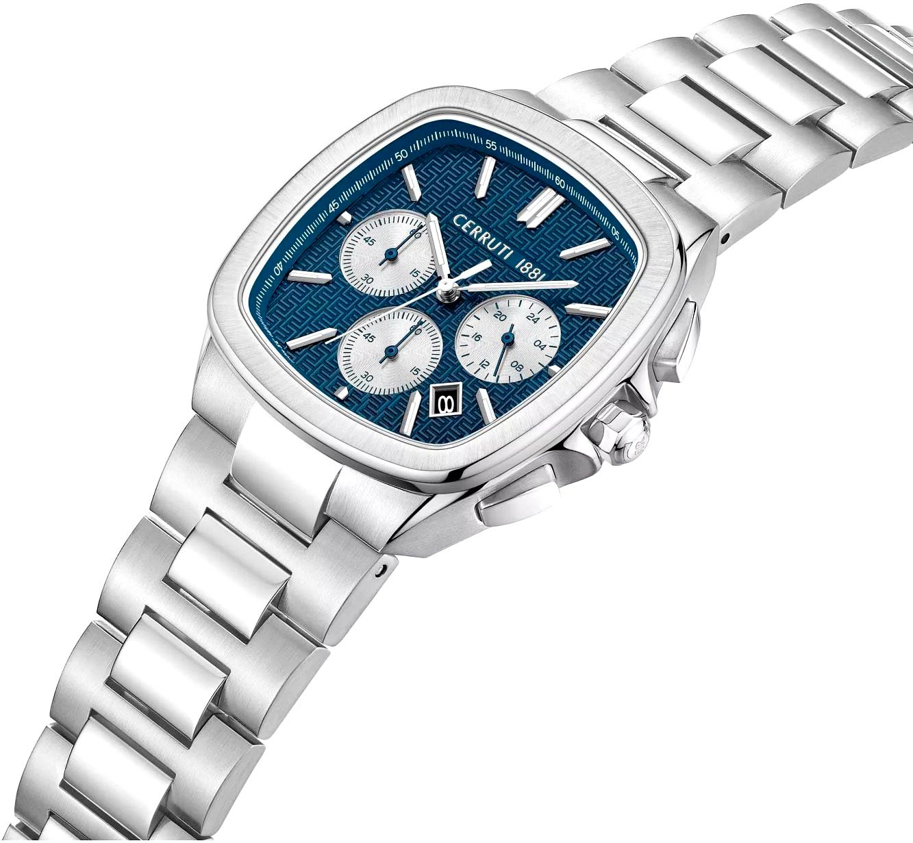 Мужские наручные часы-хронограф с секундомером Casale. Стальной квадратный корпус с матовой и полированной отделкой. 12-ти и 24-х часовой формат времени. Матовый циферблат украшен узором. Накладные метки в виде штрихов. Заостренные прямоугольные стрелки в стиле Baton. Метки и стрелки с люминесцентным покрытием, которое светится в темноте после непродолжительной зарядки на свету.