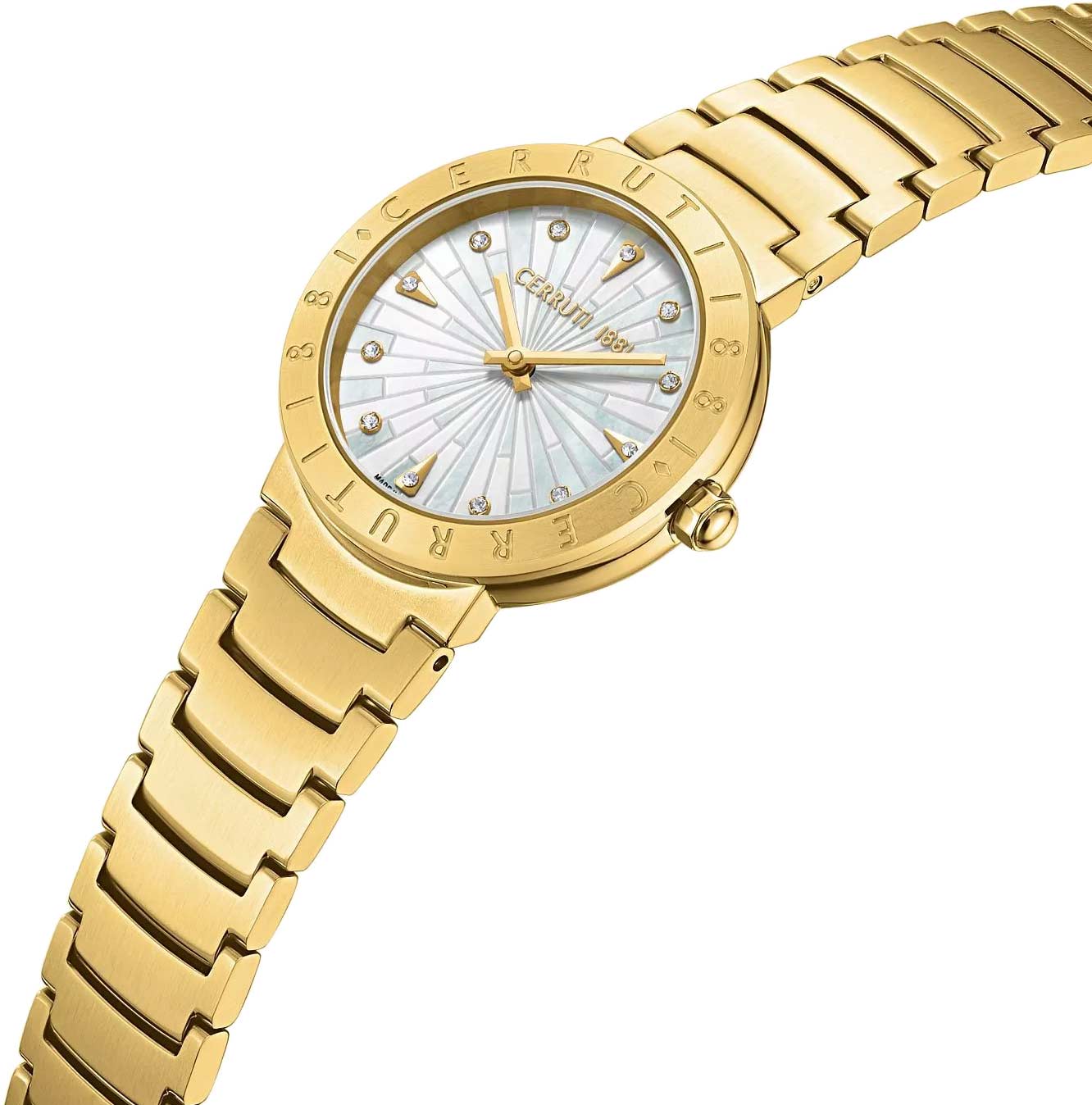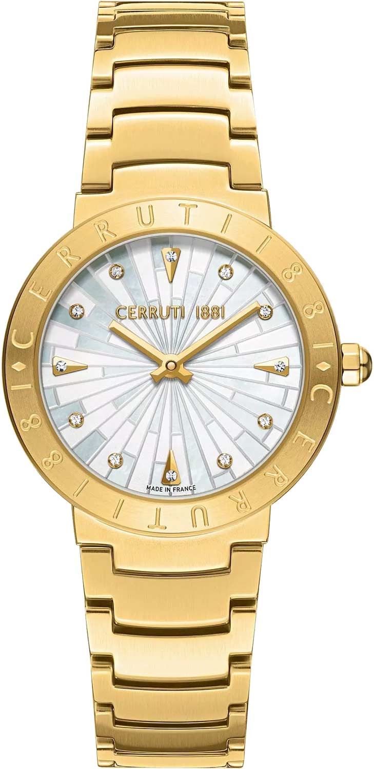 Женские наручные часы. Круглый стальной корпус. Декоративный безель украшен выгравированным логотипом. Перламутровый циферблат с мозаичным узором. Накладные метки в виде штрихов и точек, украшенных кристаллами. Прямоугольные стрелки в стиле Baton. Заводная головка в виде болта. Стальной браслет с раскладывающейся застежкой.