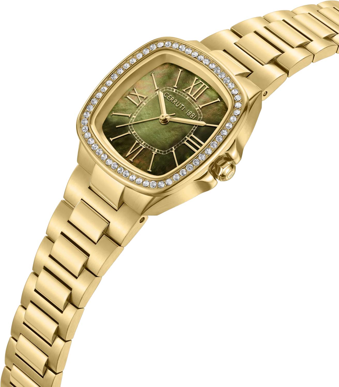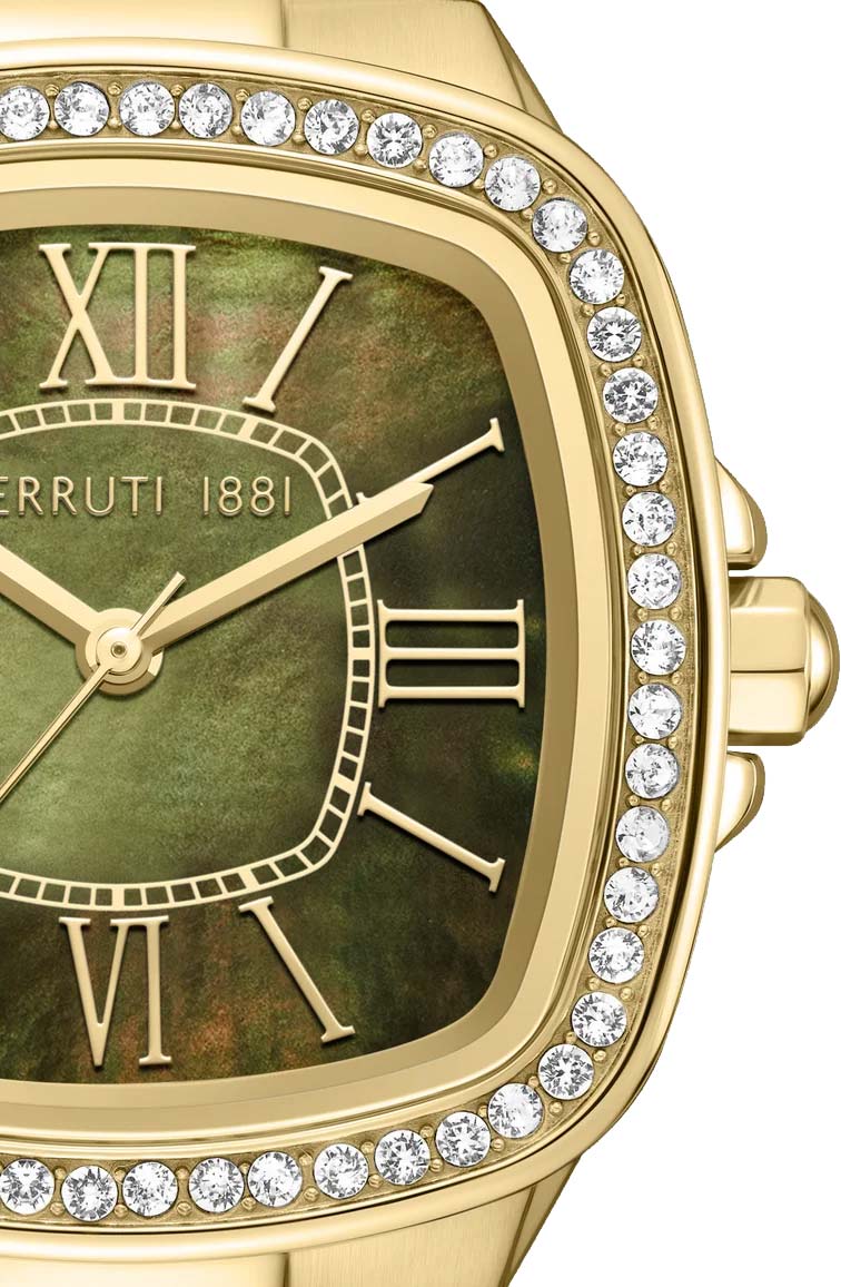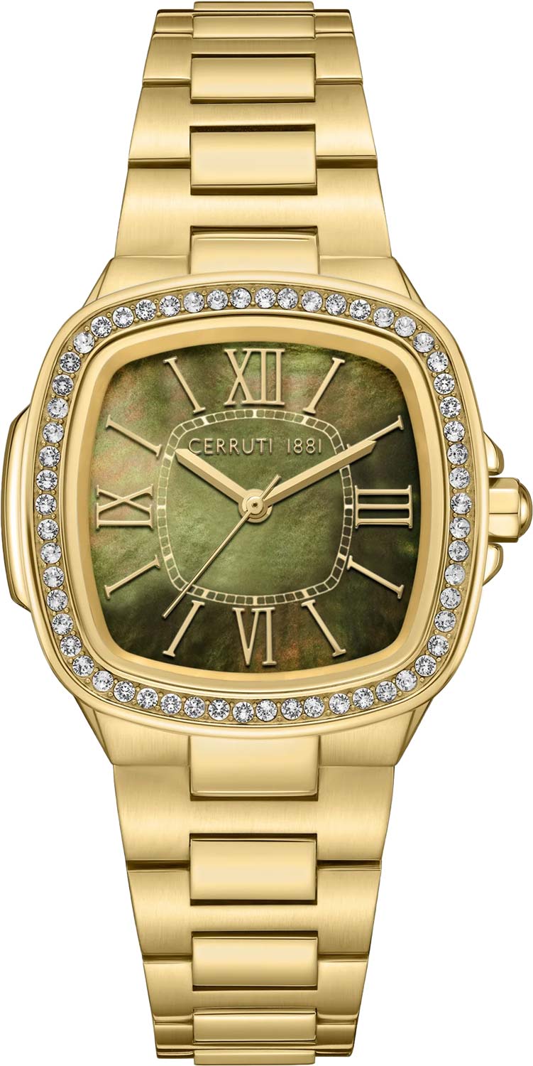 Casale. Женские наручные кварцевые часы. Стальной квадратный корпус инкрустирован кристаллами. Перламутровый циферблат с накладными метки в виде штрихов и римских цифр. Заостренные прямоугольные стрелки в стиле Baton. Стекло минеральное с сапфировым покрытием. Граненая заводная головка с защитой. Надежный стальной браслет с раскладывающейся застежкой.
