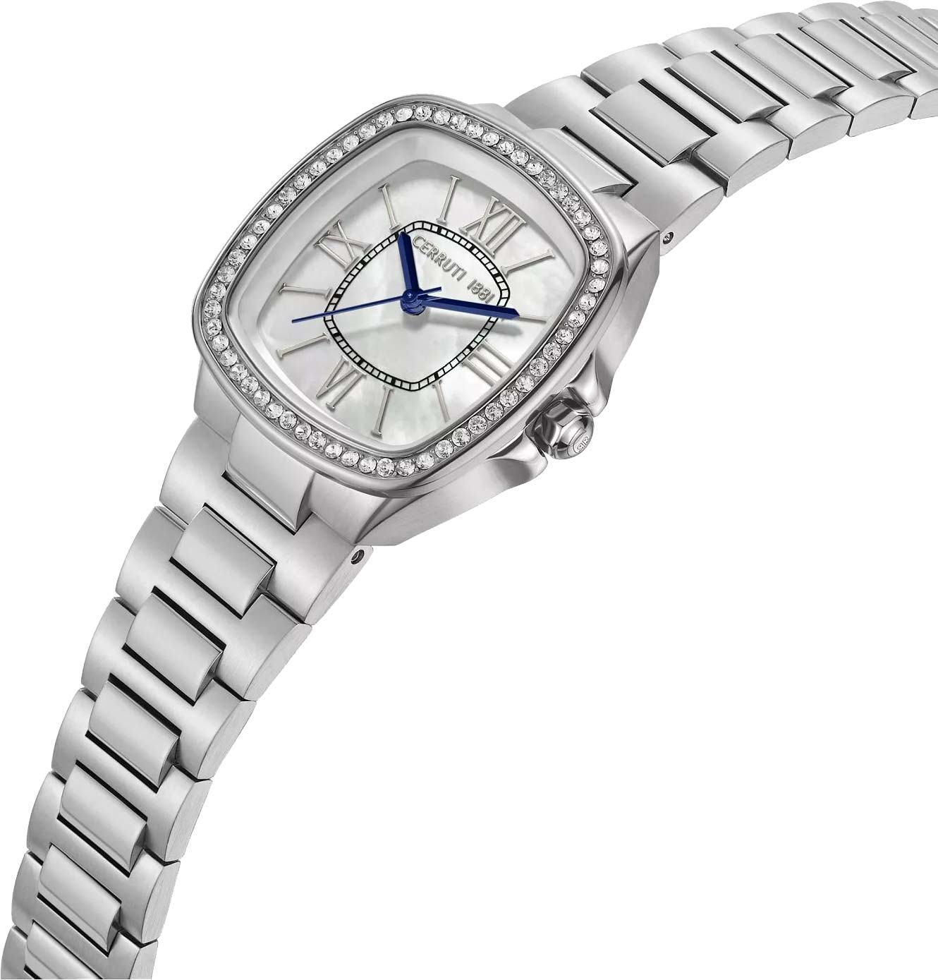 Casale. Женские наручные кварцевые часы. Стальной квадратный корпус инкрустирован кристаллами. Перламутровый циферблат с накладными метки в виде штрихов и римских цифр. Заостренные прямоугольные стрелки в стиле Baton. Стекло минеральное с сапфировым покрытием. Граненая заводная головка с защитой. Надежный стальной браслет с раскладывающейся застежкой.