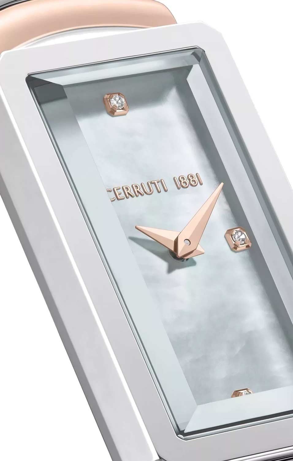 Женские наручные кварцевые часы. Стальной прямоугольный корпус. Перламутровый циферблат с накладными метками в виде точек, украшенных кристаллами. Клиновидные стрелки в стиле Dauphine. Заводная головка в виде болта с защитой. Надежный стальной браслет с раскладывающейся застежкой.