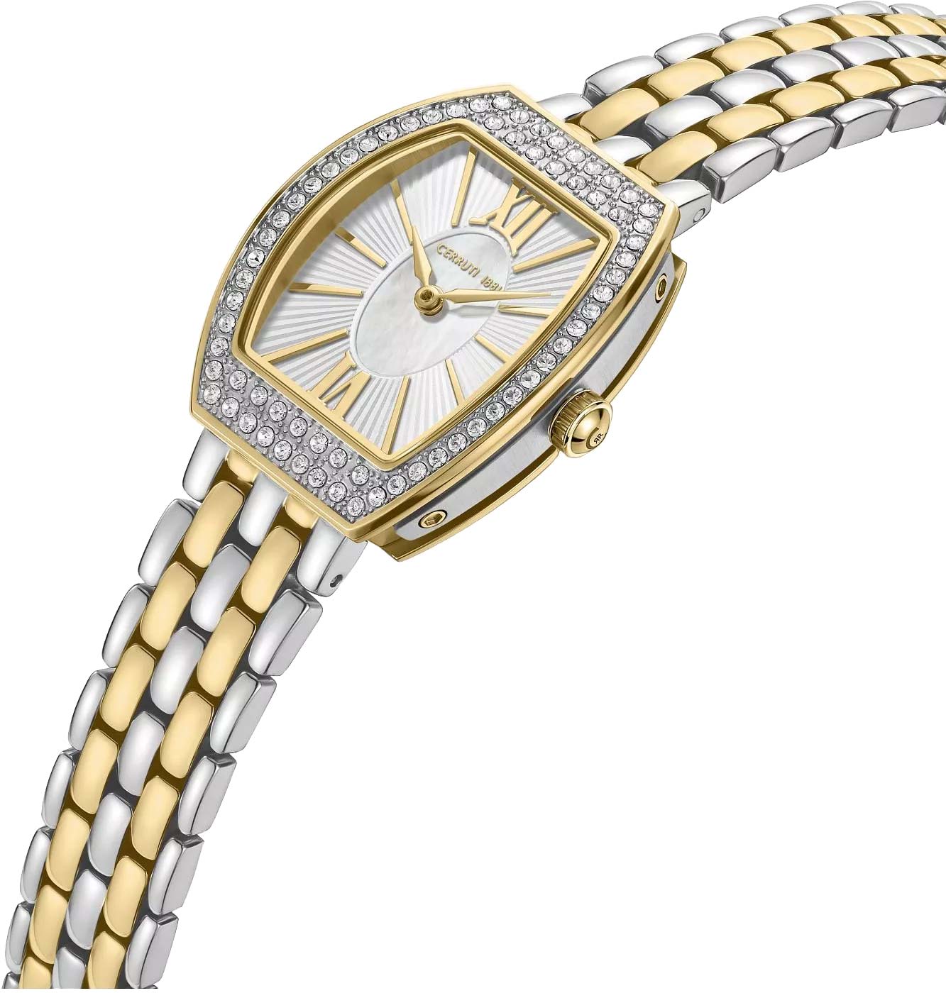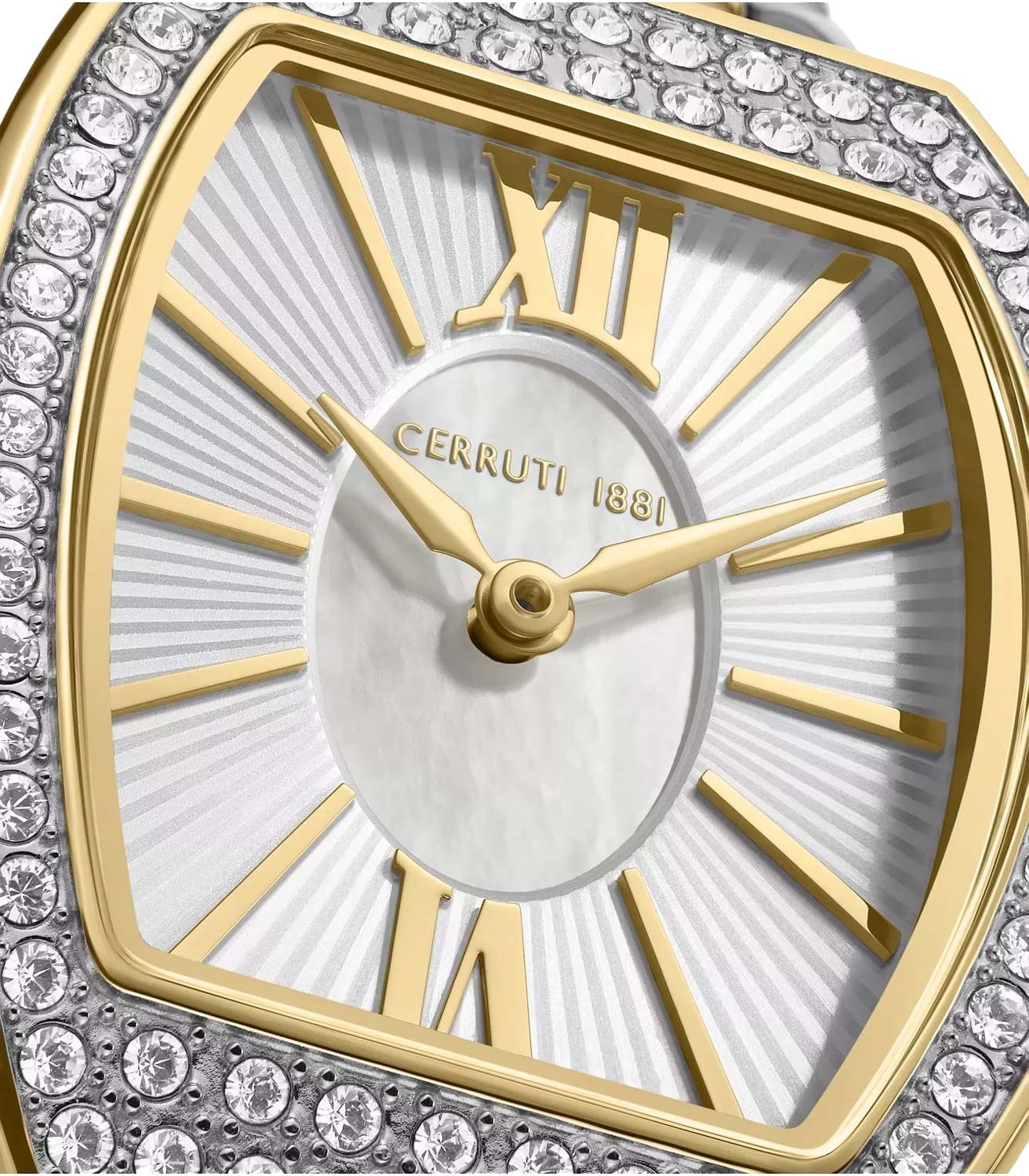 Calliano. Женские наручные кварцевые часы. Стальной корпус в форме бочки украшен паве из кристаллов. Перламутровый циферблат с накладными метками в виде штрихов и римских цифр XII и VI. Острые стрелки в стиле Alpha. Стекло минеральное с сапфировым покрытием. Граненая заводная головка. Задняя крышка крепится на 4-х винтах. Надежный стальной браслет с раскладывающейся застежкой.