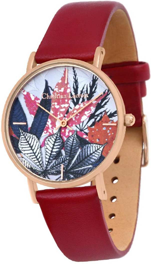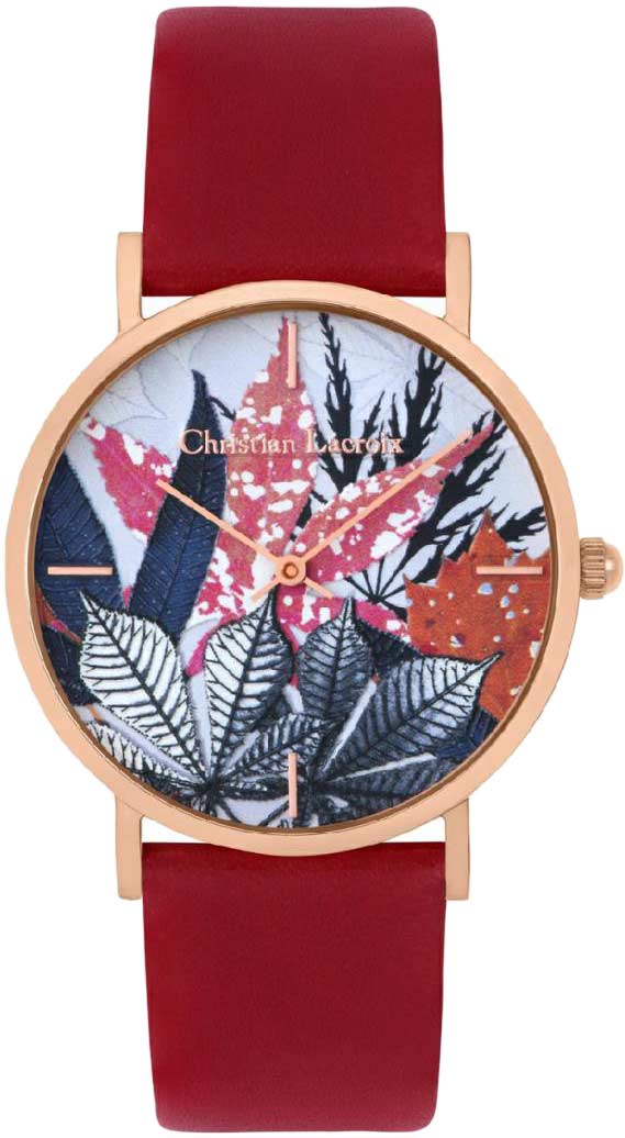 Женские наручные часы. Круглый корпус из нержавеющей стали. Циферблат с растительным дизайном защищен минеральным стеклом. Метки в виде штрихов. Рифленая заводная головка. Кожаный ремешок с классической застежкой.