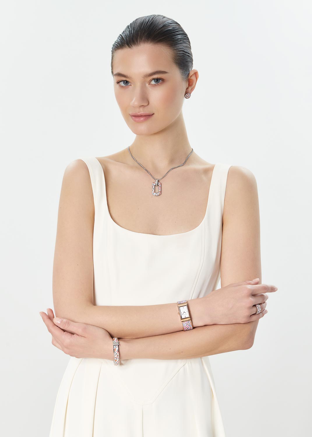 Женские наручные часы. Прямоугольный корпус из нержавеющей стали. Циферблат защищен минеральным стеклом. Метки в виде штрихов. Рифленая заводная головка. Стальной браслет с лакированным экзотическим цветочным принтом.