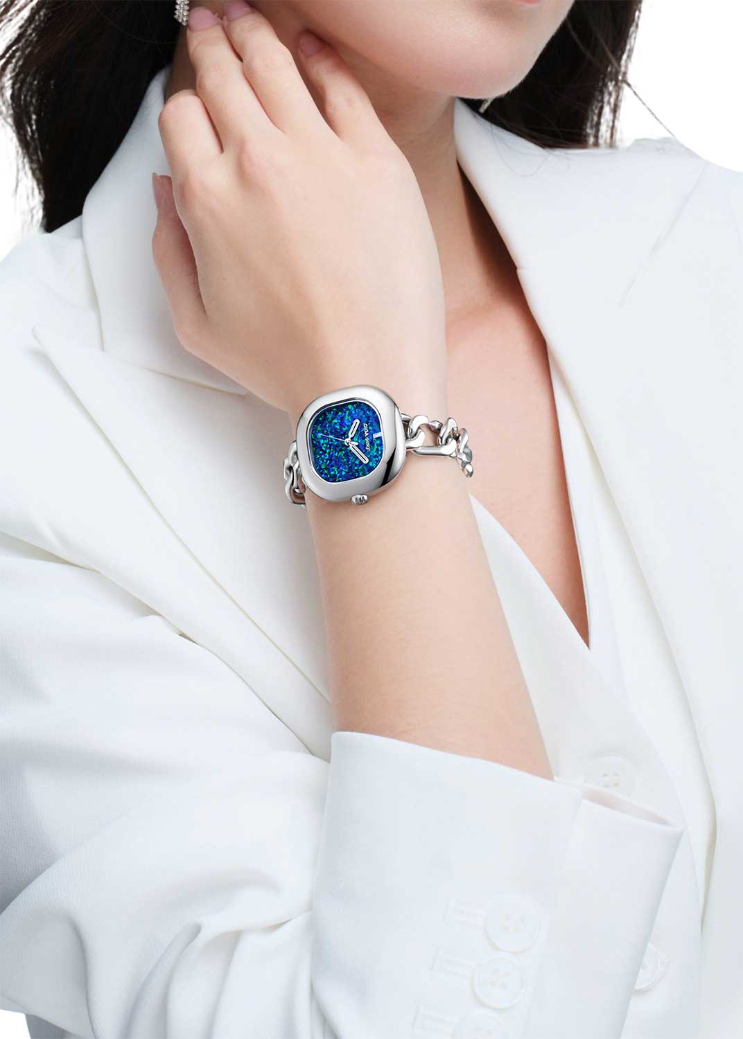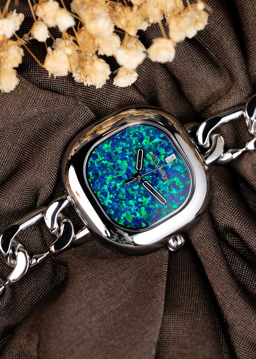 Женские часы Aglaia. Квадратный корпус выполнен из стали 316L. Циферблат защищен минеральным стеклом. Задняя крышка крепится на 4-х винтах. Браслет выполнен в виде цепочки с магнитной застежкой.