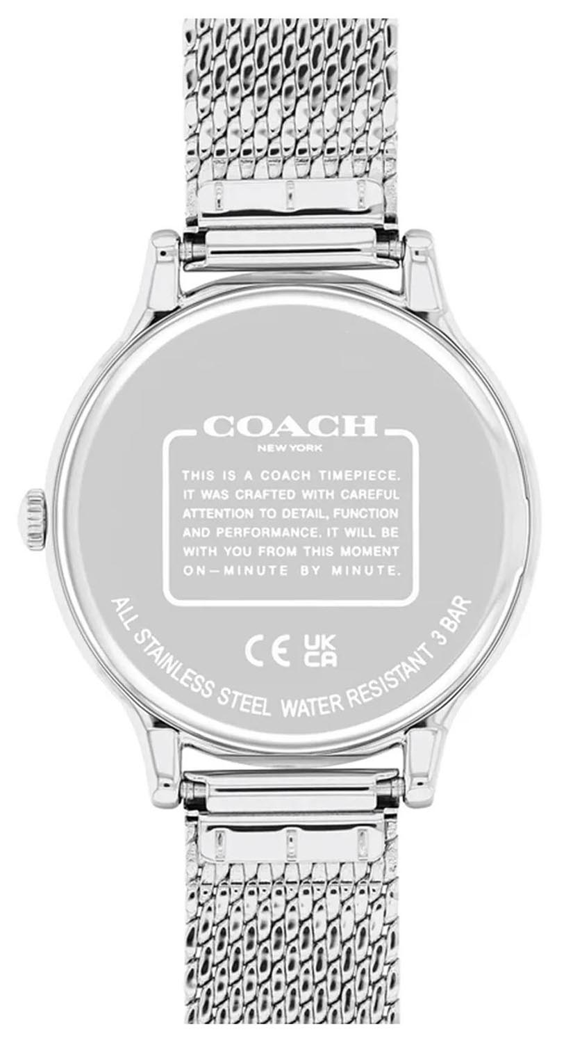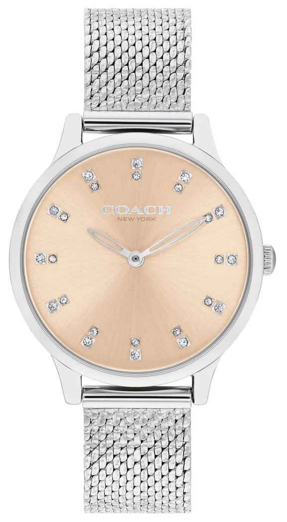 Универсальный аксессуар, подходящий к любому образу. Женские часы с круглым корпусом. Циферблат выполнен по технологии Sunray (солнечные лучи). Метки в виде точек, украшенных кристаллами. Рифленая заводная головка. На задней крышке обращение от COACH к своим клиентам. Миланский браслет.