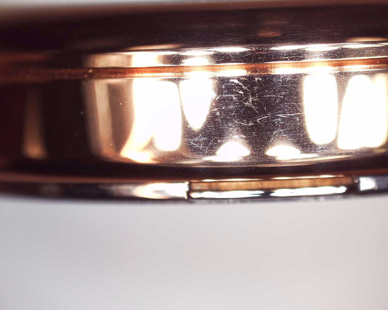 Женские часы с круглым корпусом. Циферблат выполнен по технологии Sunray (солнечные лучи). Метки в виде точек, украшенных кристаллами. Рифленая заводная головка. На задней крышке обращение от COACH к своим клиентам. Миланский браслет.