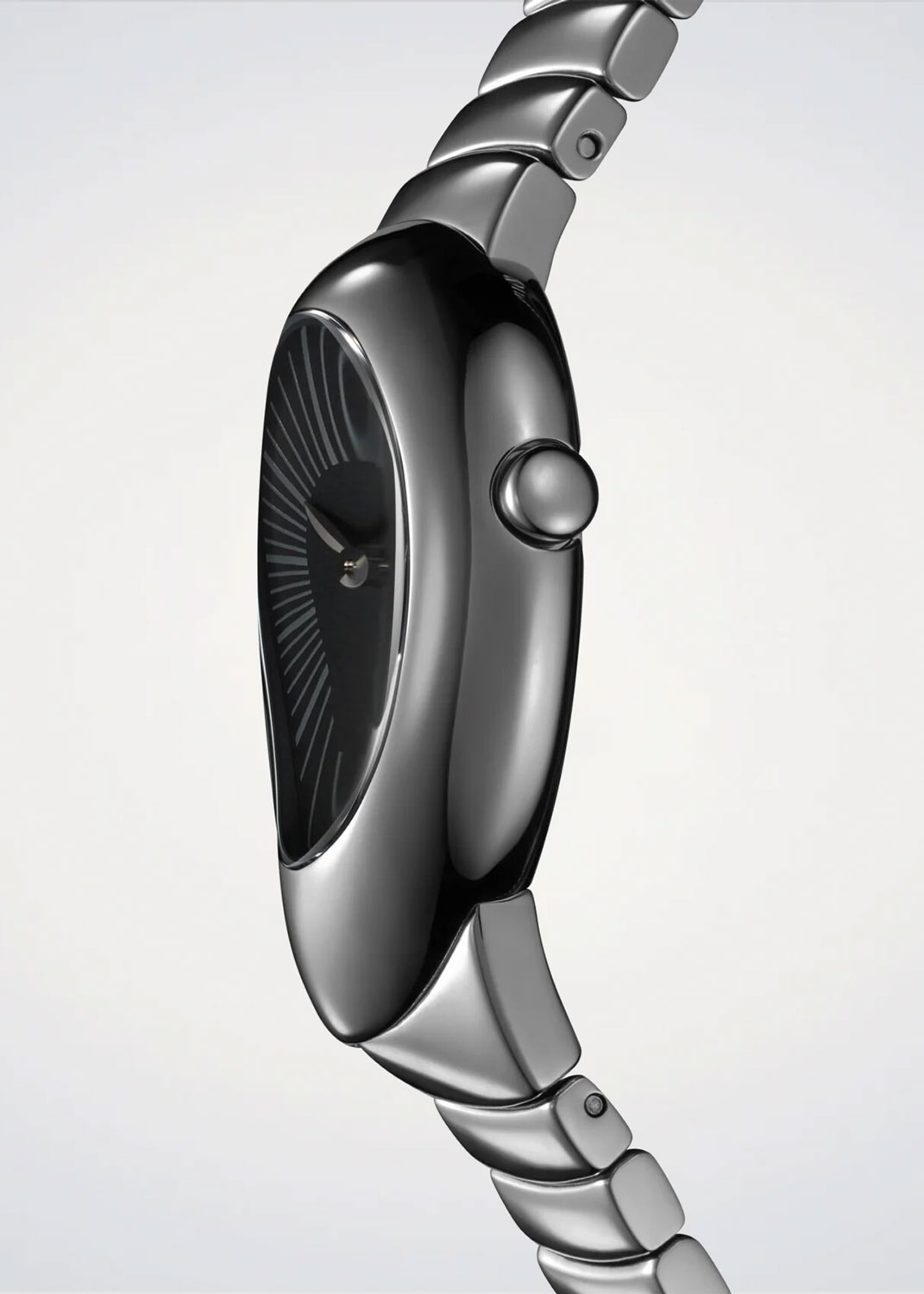 Женские часы Dropmist. Стальной корпус в форме капли. Черный циферблат с метками в виде штрихов. Секундная стрелка отсутствует. Задняя крышка крепится на 4-х винтах. Стальной браслет с раскладывающейся застежкой.