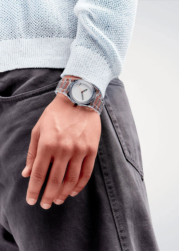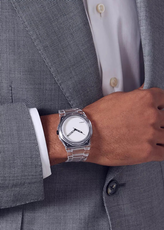 Наручные часы унисекс Nylon Exp_Riviera с корпусом из прозрачного голубого нейлона. Матовый голубой циферблат без меток. Стрелки в стиле Skeleton из латуни.