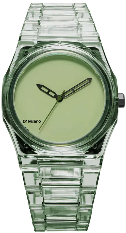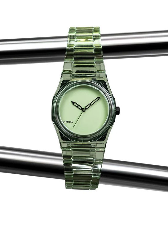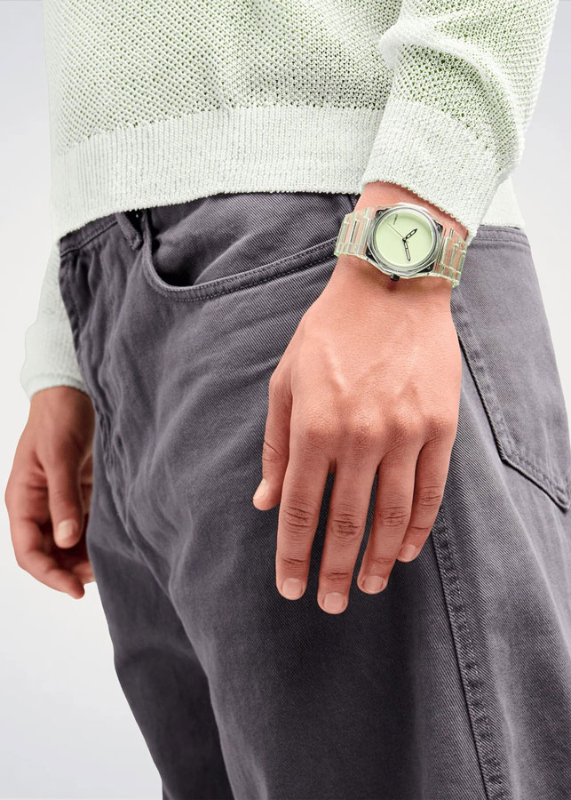 Наручные часы унисекс Nylon Exp_Mint с корпусом из прозрачного зеленого нейлона. Матовый зеленый циферблат без меток. Стрелки в стиле Skeleton из латуни.