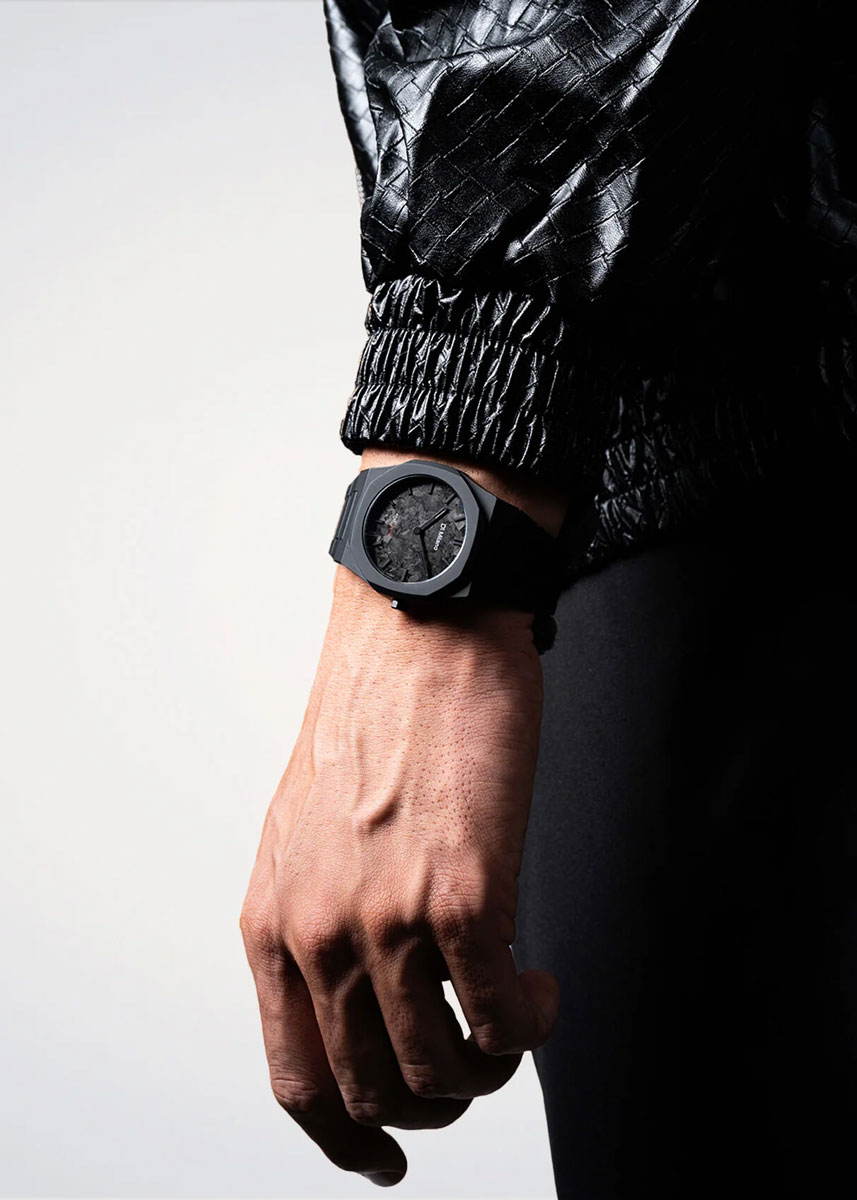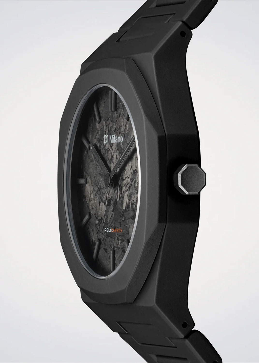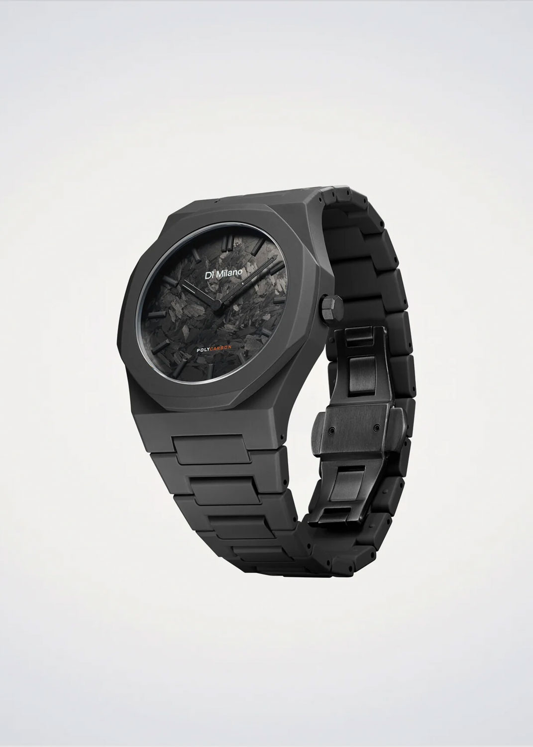 Наручные часы Poly Carbonium из поликарбоната. Циферблат из углеродного волокна. Метки в виде штрихов. Стальная задняя крышка крепится на 4-х винтах. Индивидуальный серийный номер. Браслет с раскладывающейся застежкой.