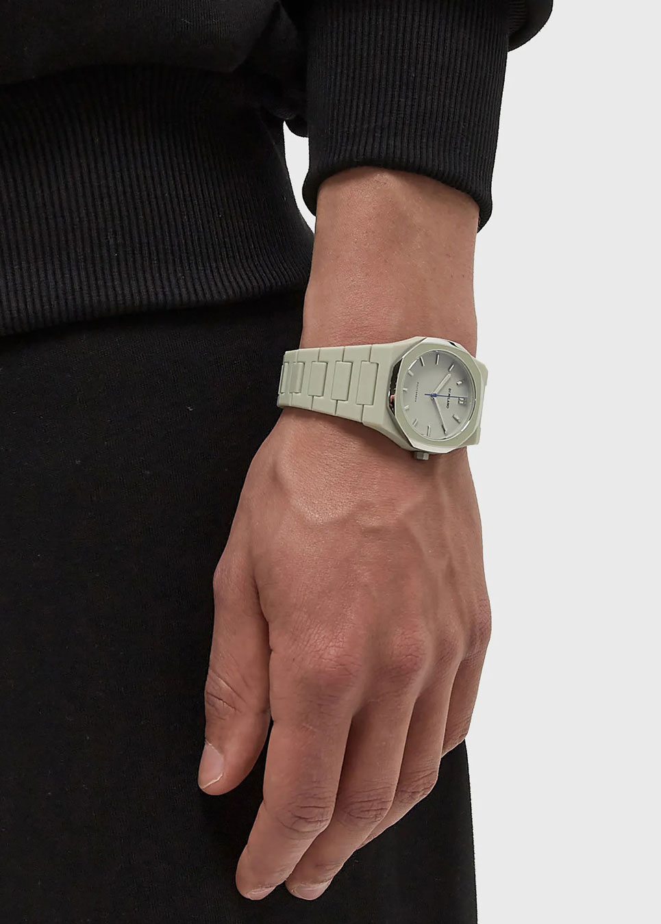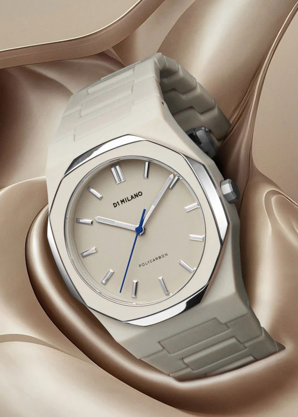 Наручные часы унисекс Polycarbon Grey Mesh с корпусом из серо-бежевого поликарбоната с покрытием Soft-Touch. Полированный стальной безель с эмалью. Матовый серый циферблат. Накладные метки в виде штрихов. Стрелки из латуни.