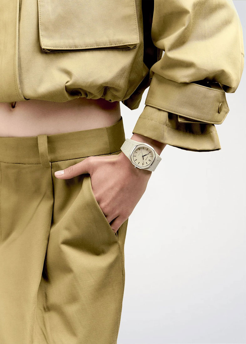 Граненая заводная головка. Стальная задняя крышка крепится на 4-х винтах. Браслет из серо-бежевого поликарбоната с покрытием Soft-Touch. Скрытая застежка-бабочка.