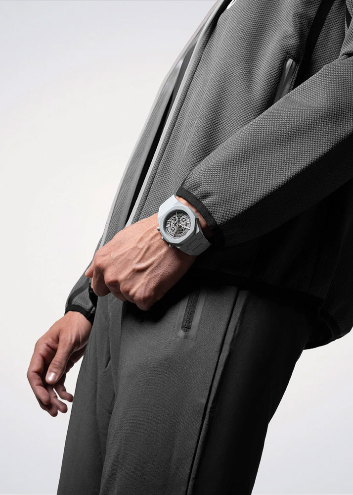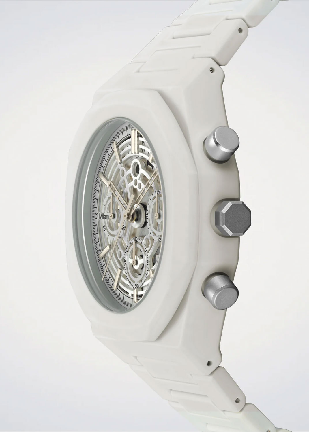 Скелетонизированные часы-хронограф с секундомером Polychrono Model L. Выполнены из поликарбоната с покрытием Soft-Touch. Метки в виде штрихов. Окошко даты находится в положении между 4 и 5 часами. Стальная задняя крышка крепится на 4-х винтах. Индивидуальный серийный номер. Браслет с раскладывающейся застежкой.