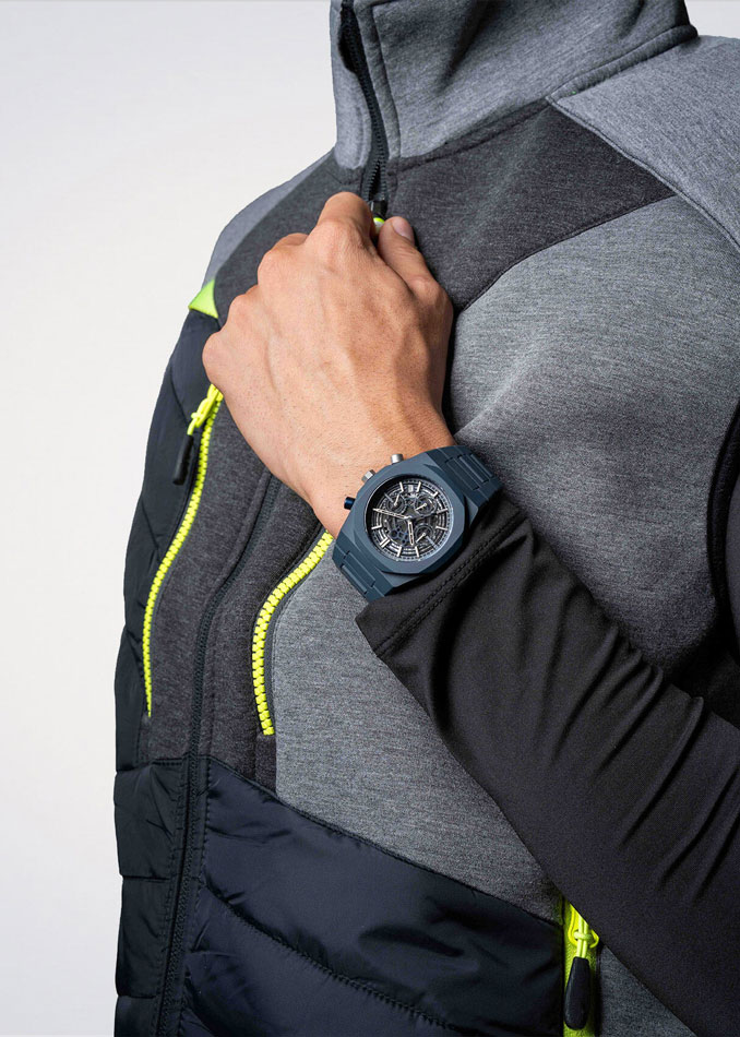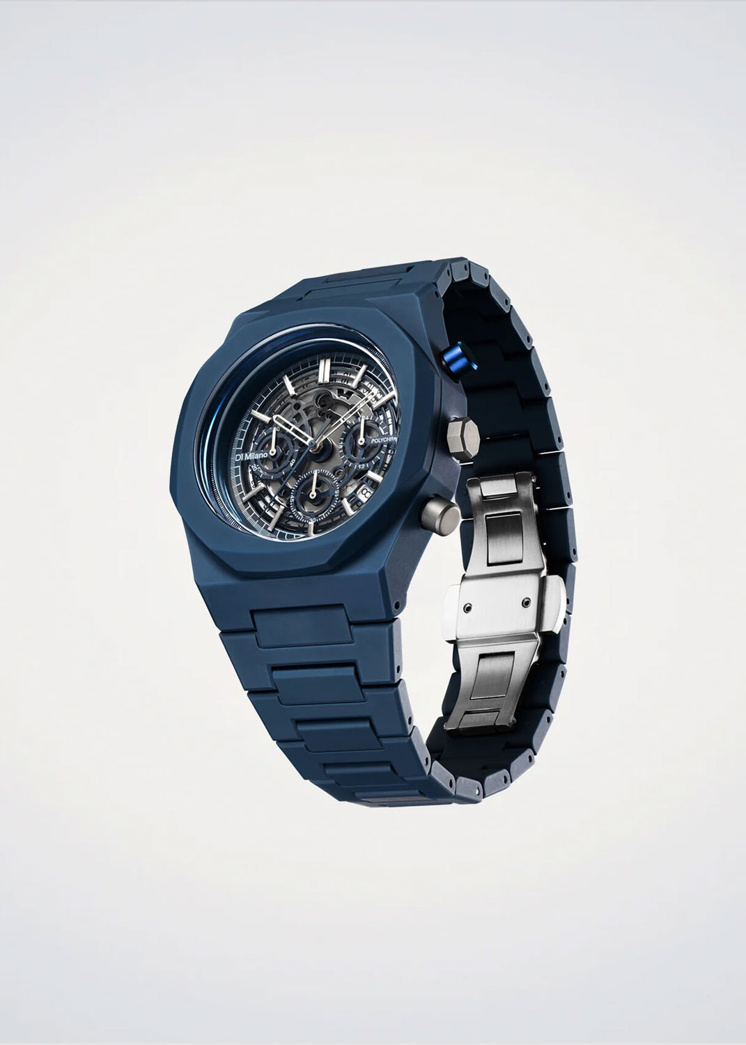 Скелетонизированные часы-хронограф с секундомером Polychrono Model B. Выполнены из поликарбоната с покрытием Soft-Touch. Метки в виде штрихов. Окошко даты находится в положении между 4 и 5 часами. Стальная задняя крышка крепится на 4-х винтах. Индивидуальный серийный номер. Браслет с раскладывающейся застежкой.