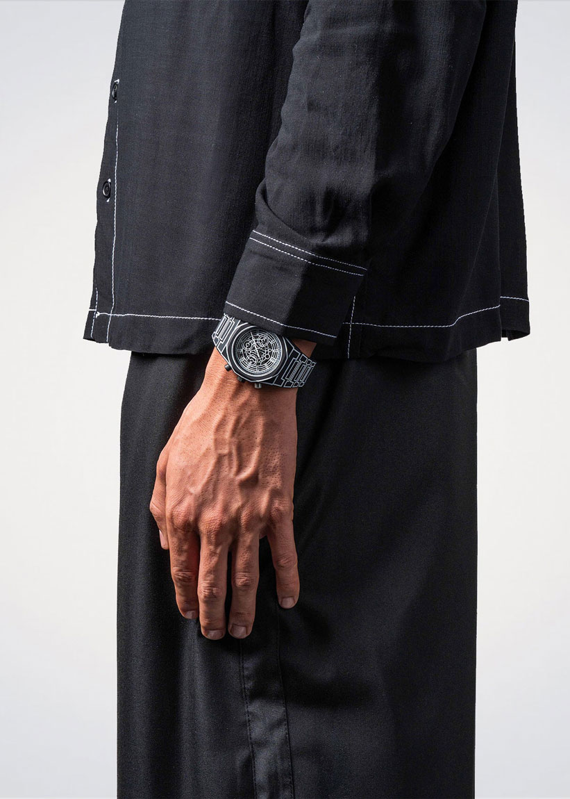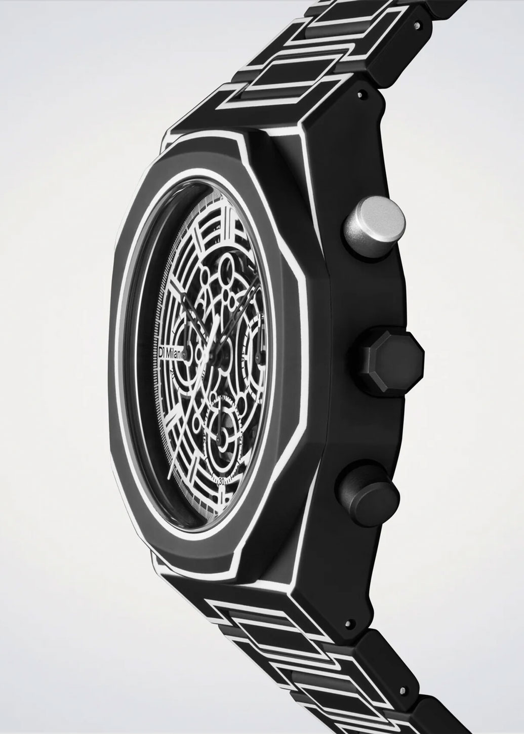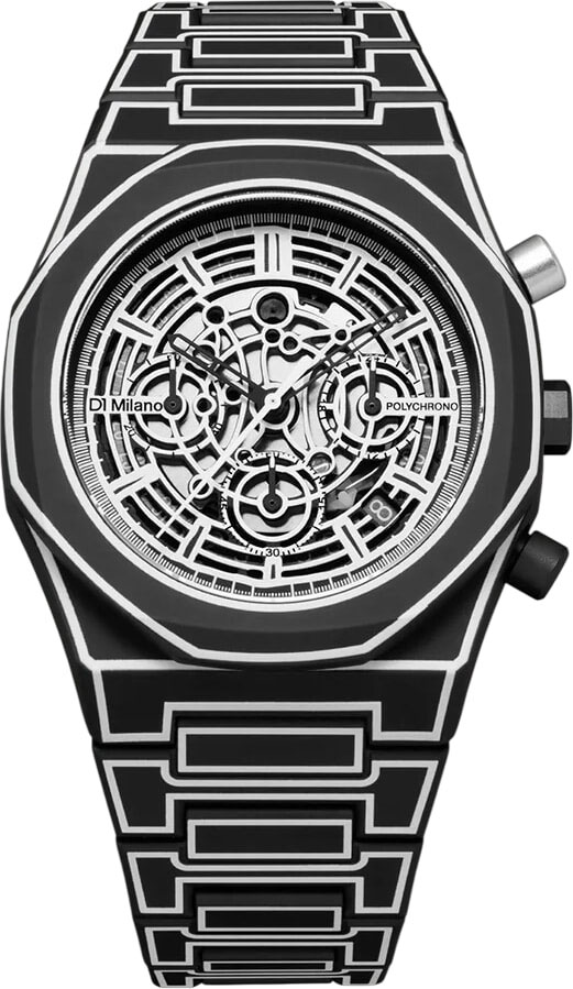 Скелетонизированные часы-хронограф с секундомером Polychrono Black Sketch. Выполнены из поликарбоната с покрытием Soft-Touch. Метки в виде штрихов. Окошко даты находится в положении между 4 и 5 часами. Стальная задняя крышка крепится на 4-х винтах. Индивидуальный серийный номер. Браслет с раскладывающейся застежкой.