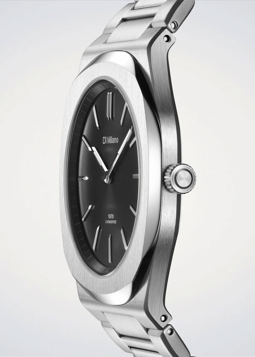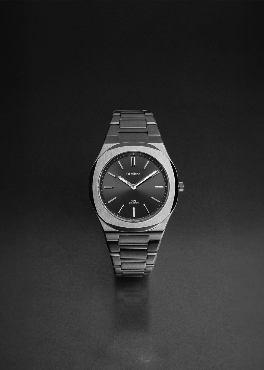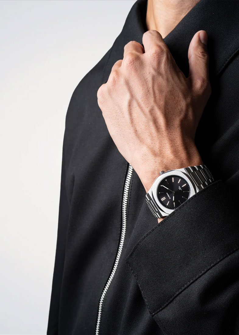 Мужские часы Groovy Black. Ультратонкие. Круглый стальной корпус. Циферблат с накладными метками в виде штрихов. Задняя крышка из нержавеющей стали крепится на 8-ми винтах. Рифленая заводная головка. Стальной браслет с раскладывающейся застежкой.