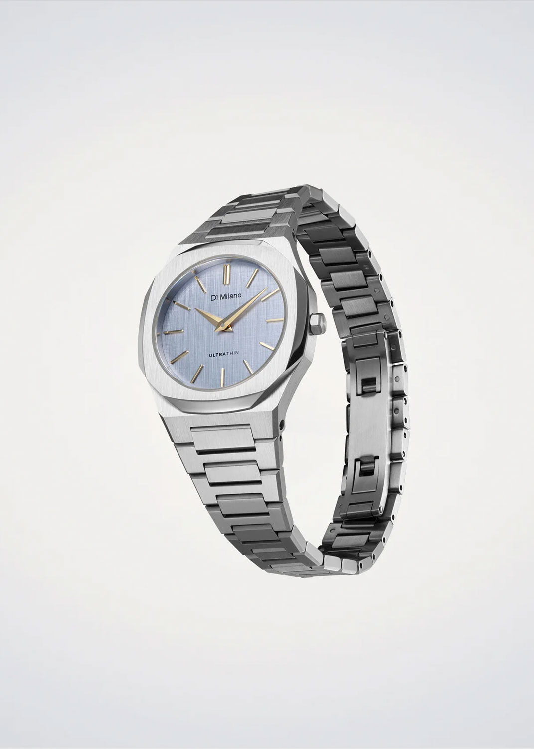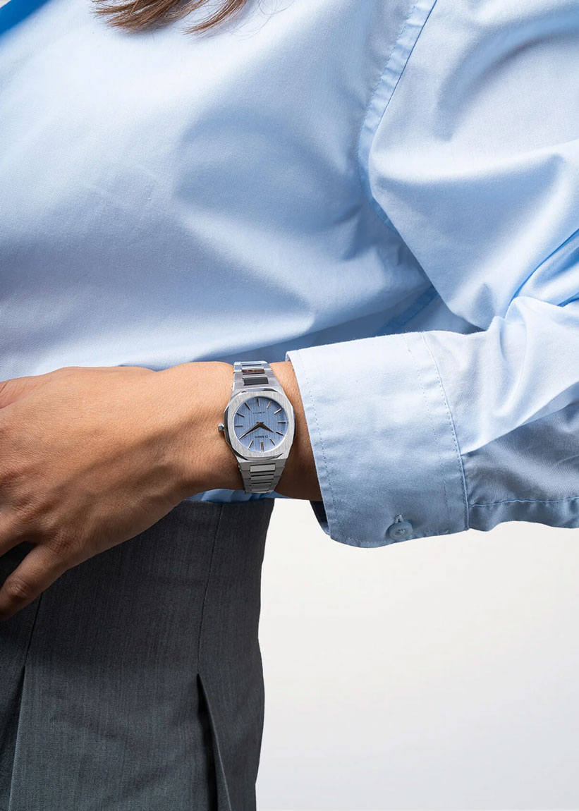 Женские часы Indigo Loom. Ультратонкие. Круглый стальной корпус. Циферблат с метками в виде штрихов. Клиновидные стрелки в стиле Dauphine. Секундная стрелка отсутствует. Задняя крышка крепится на 8-ми винтах. Индивидуальный серийный номер. Браслет с раскладывающейся застежкой.