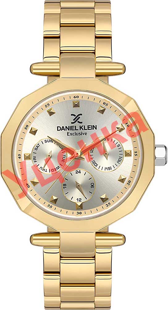 Женские кварцевые часы. Оригинальный металлический корпус с IP покрытием цвета желтого золота. Циферблат выполнен по технологии Sunray (солнечные лучи), украшен фирменным логотипом Daniel Klein в положении 12 часов и защищен минеральным стеклом. Метки в виде точек. Клиновидные стрелки в стиле Dauphine. Указатели даты и дня недели вынесены на отдельные циферблаты. 12-ти и 24-х часовой формат времени. Граненая заводная головка. Стальной браслет с IP покрытием цвета желтого золота и раскладывающейся застежкой.