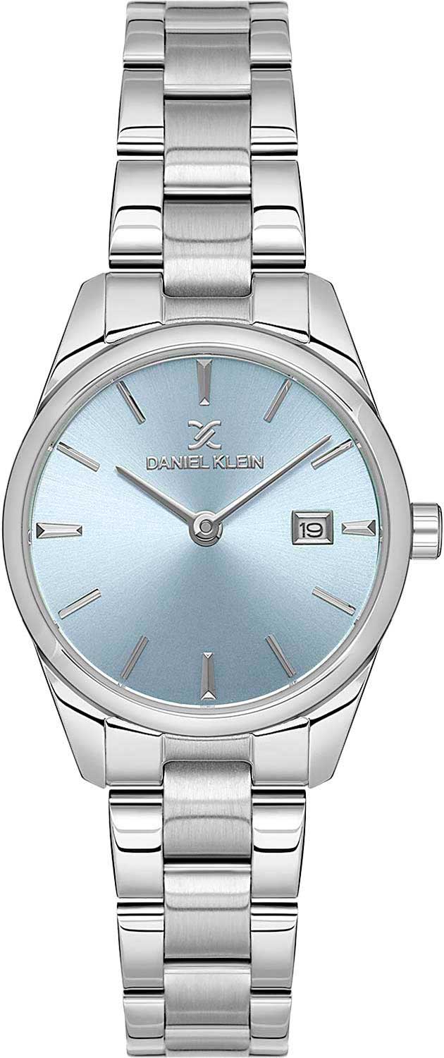 Женские кварцевые часы. Круглый металлический корпус с IP покрытием. Циферблат выполнен по технологии Sunray (солнечные лучи), украшен фирменным логотипом Daniel Klein в положении 12 часов и защищен минеральным стеклом. Метки в виде штрихов. Секундная стрелка отсутствует. Окошко даты находится в положении 3 часа. Гладкая заводная головка. Стальной браслет с раскладывающейся застежкой.