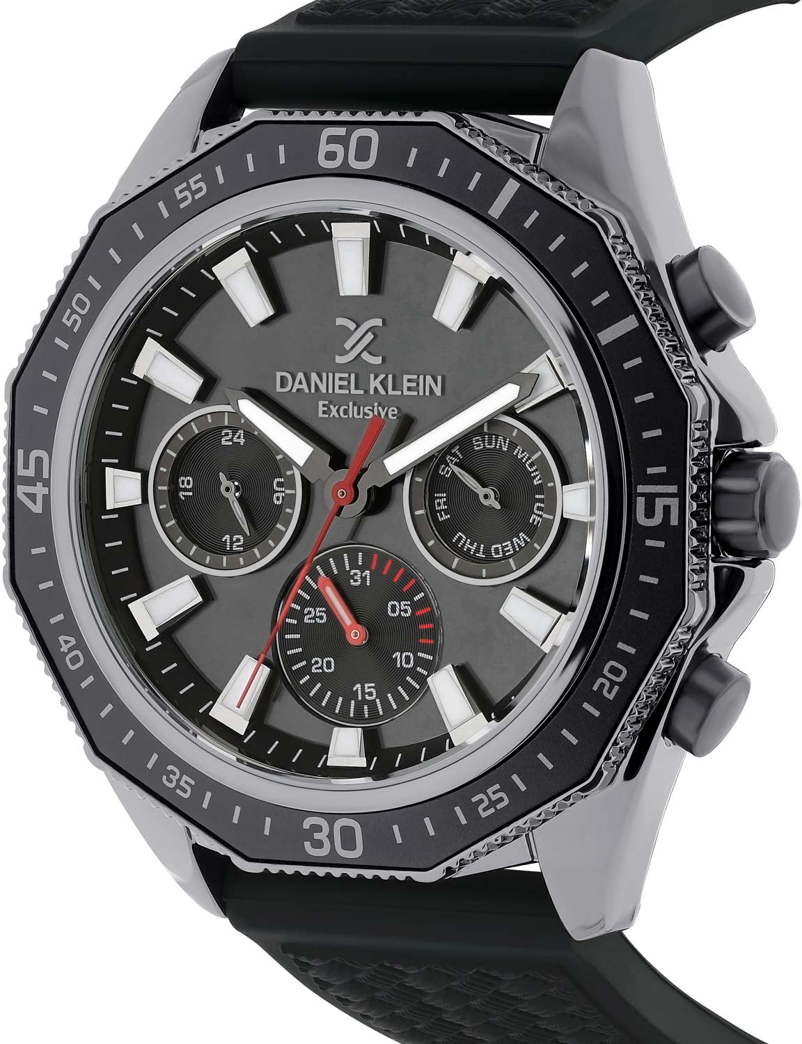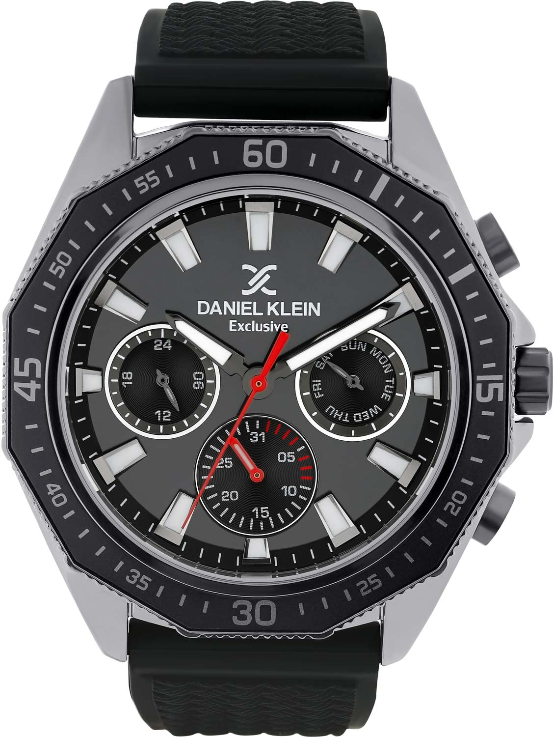 Уникальные в своем роде мужские часы идеально подчеркнут неповторимую индивидуальность своего владельца. Мужские кварцевые часы-хронограф с тахиметром. Оригинальный металлический корпус с черным IP покрытием. Алюминиевый двенадцатиугольный рифленый безель с минутной шкалой. Циферблат выполнен по технологии Sunray (солнечные лучи), украшен фирменным логотипом Daniel Klein в положении 12 часов и защищен минеральным стеклом. Метки в виде штрихов и стрелки с люминесцентным покрытием, которое светится в темноте после непродолжительной зарядки на свету. Указатели даты и дня недели вынесены на отдельные циферблаты. 12-ти и 24-х часовой формат времени. Заводная головка с защитой. Удобный силиконовый ремешок с классической застежкой.