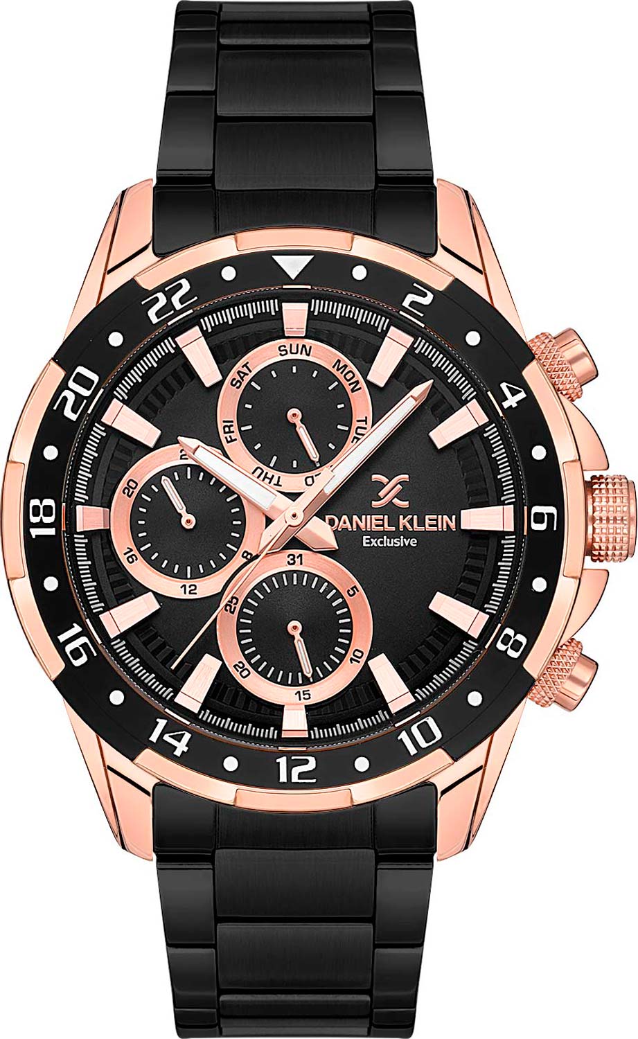 Эффектные и функциональные часы - идеальный выбор для современных стильных мужчин. Мужские кварцевые часы. Круглый металлический корпус с IP покрытием. Алюминиевый безель. Циферблат украшен фирменным логотипом Daniel Klein в положении 3 часа и защищен минеральным стеклом. Метки в виде штрихов. По краю циферблата нанесена секундная шкала с шагом 0,2 секунды. Стрелки с люминесцентным покрытием, которое светится в темноте после непродолжительной зарядки на свету. Указатели даты и дня недели вынесены на отдельные циферблаты. 12-ти и 24-х часовой формат времени. Заводная головка с защитой. Частично полированный и сатинированный стальной браслет с черным IP покрытием и раскладывающейся застежкой.