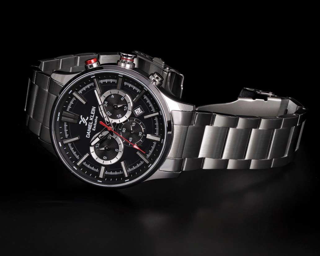 Яркие и функциональные часы по достоинству оценят мужчины, идущие в ногу со временем. Мужские кварцевые часы. Круглый металлический корпус с IP покрытием. Циферблат с метками в виде штрихов украшен фирменным логотипом Daniel Klein в положении 12 часов и защищен минеральным стеклом. По краю циферблата нанесена секундная шкала с шагом 0,2 секунды. Стрелки с люминесцентным покрытием, которое светится в темноте после непродолжительной зарядки на свету. Окошко даты находится между отметками 4 и 5 часов. 12-ти и 24-х часовой формат времени. Второй часовой пояс. Стальной браслет с раскладывающейся застежкой.
