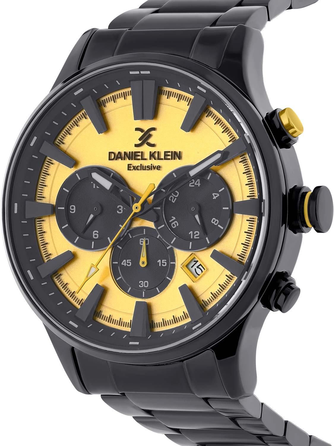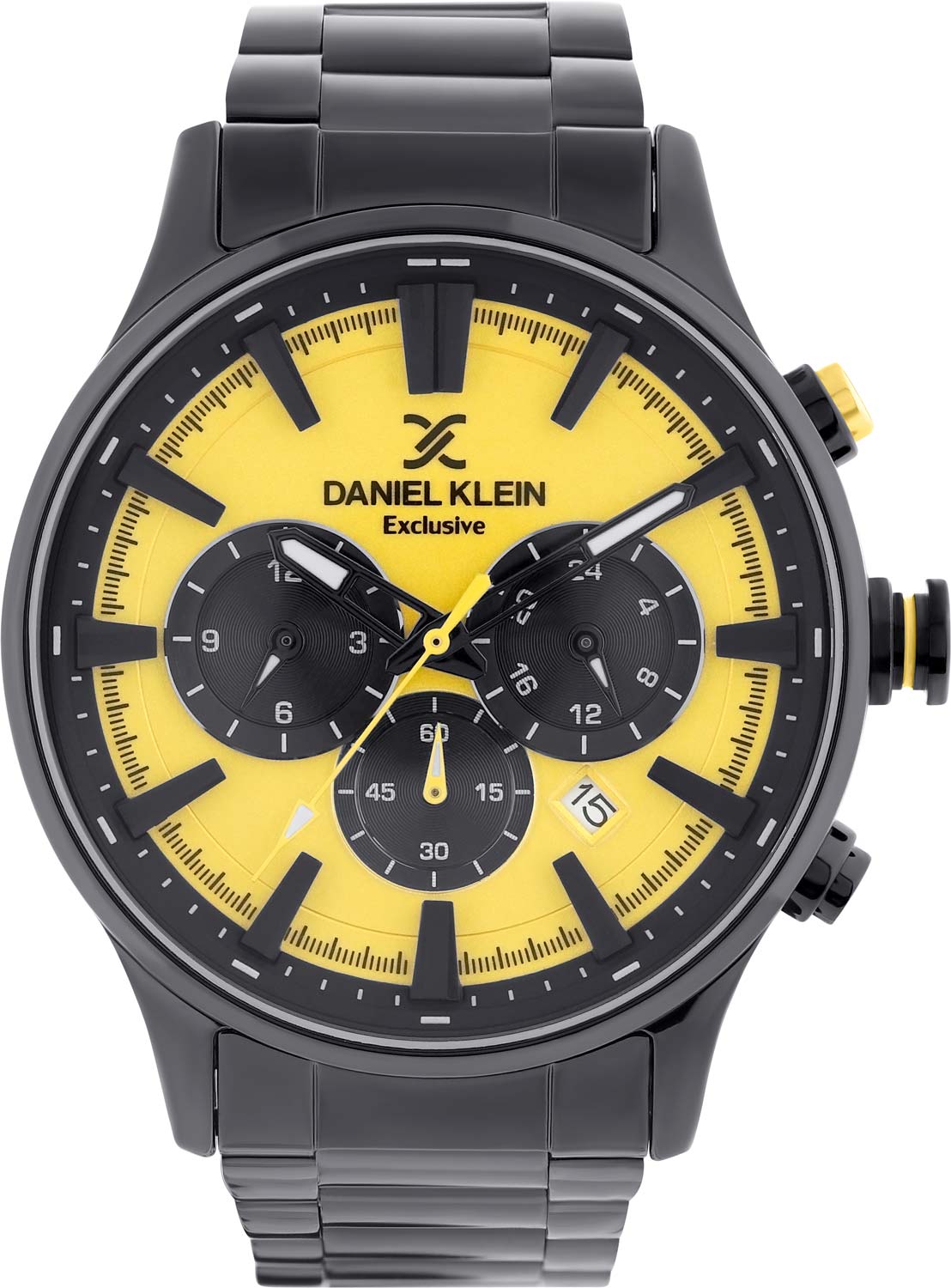 Яркие и функциональные часы по достоинству оценят мужчины, идущие в ногу со временем.Мужские кварцевые часы. Круглый металлический корпус с черным IP покрытием. Циферблат с метками в виде штрихов украшен фирменным логотипом Daniel Klein в положении 12 часов и защищен минеральным стеклом. По краю циферблата нанесена секундная шкала с шагом 0,2 секунды. Стрелки с люминесцентным покрытием, которое светится в темноте после непродолжительной зарядки на свету. Окошко даты находится между отметками 4 и 5 часов. 12-ти и 24-х часовой формат времени. Второй часовой пояс. Стальной браслет с черным IP