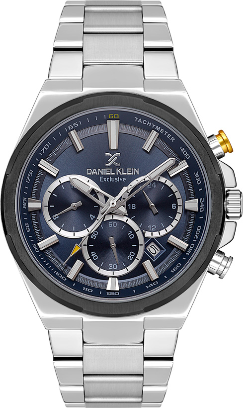 Функциональные и надежные часы для мужчин, ведущих активный образ жизни. Exclusive. Мужские часы с тахиметром. 12-ти и 24-х часовой формат времени. Второй часовой пояс. Окошко даты находится между отметками 4 и 5 часов. Циферблат украшен фирменным логотипом Daniel Klein. Метки в виде штрихов. Метки и стрелки с люминесцентным покрытием, которое светится в темноте после непродолжительной зарядки на свету. Рифленая заводная головка с защитой. Надежный стальной браслет с раскладывающейся застежкой.
