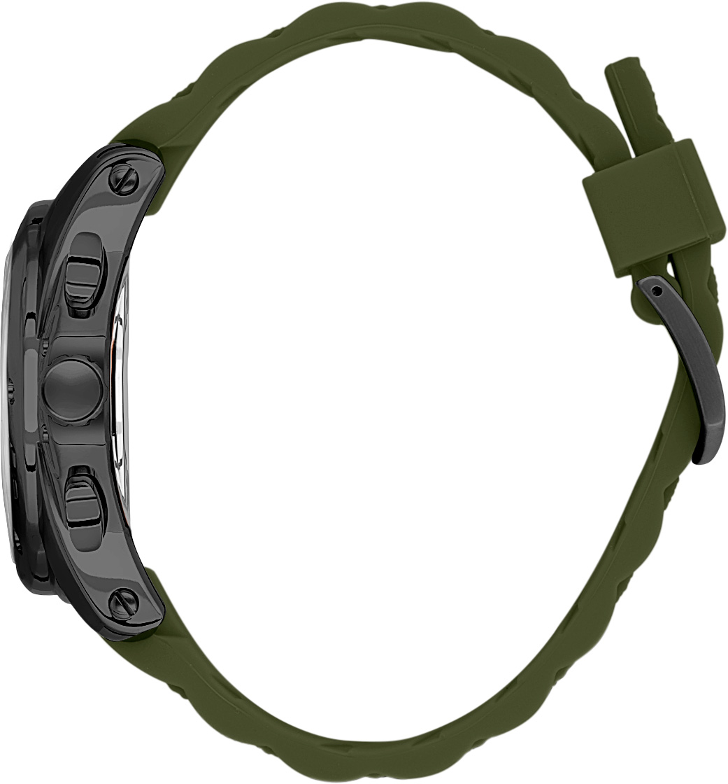 Оригинальные часы с необычным корпусом созданы для ценителей модных и практичных аксессуаров. Exclusive. 12-ти и 24-х часовой формат времени. Дата и день недели вынесены на отдельные циферблаты. Метки в виде штрихов. Стрелки и метки с люминесцентным покрытием, которое светится в темноте после непродолжительной зарядки на свету. Рифленая заводная головка. Удобный силиконовый ремешок с классической застежкой.