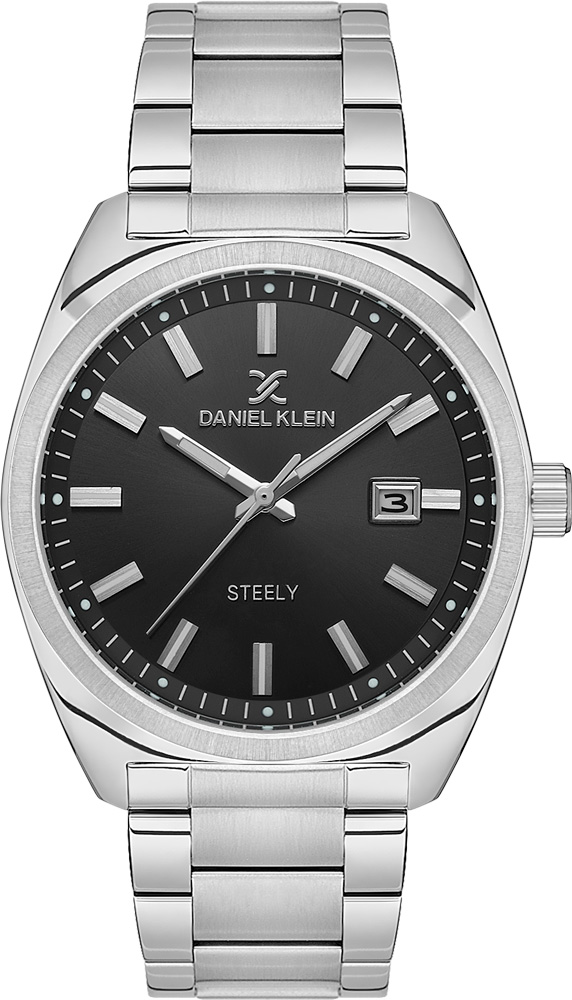 Классические линии корпуса, лаконичный циферблат и удобный стальной браслет - идеальные мужские часы на каждый день. Steely. Мужские часы со стальным корпусом. Циферблат украшен фирменным логотипом Daniel Klein. Метки в виде штрихов. Окошко даты в положении 3 часа. Стрелки и метки с люминесцентным покрытием, которое светится в темноте после непродолжительной зарядки на свету. Рифленая заводная головка. Надежный браслет с раскладывающейся застежкой.