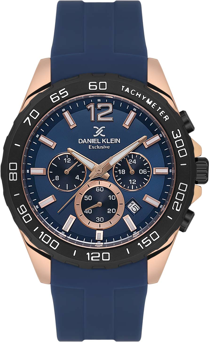Дополнительные функции делают эту модель очень удобной для каждодневного использования. Мужские часы-хронограф с секундомером и тахиметром. Круглый металлический корпус. 12-ти и 24-х часовой формат времени. Циферблат выполнен по технологии Sunray (солнечные лучи) и украшен фирменным логотипом Daniel Klein. Метки в виде штрихов и арабской цифры 12. Окошко даты находится между часовыми метками 4 и 5. Рифленая заводная головка с защитой. Силиконовый ремешок с классической застежкой.
