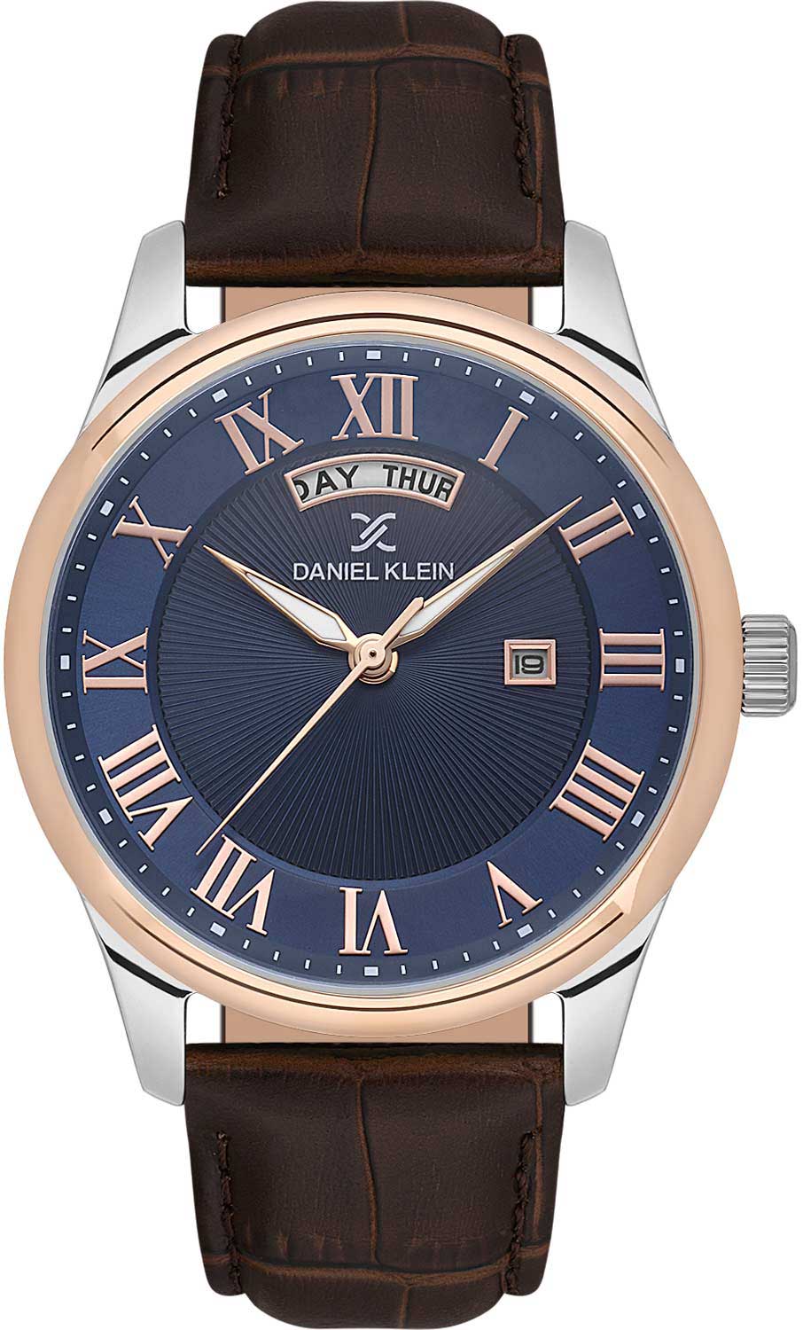 Мужские наручные часы. Круглый металлический корпус. Гильошированный циферблат украшен фирменным логотипом Daniel Klein. Метки в виде римских цифр. Окошко даты находится в положении 3 часа. Окошко дня недели находится в положении 12 часов. Рифленая заводная головка. Кожаный ремешок с классической застежкой.