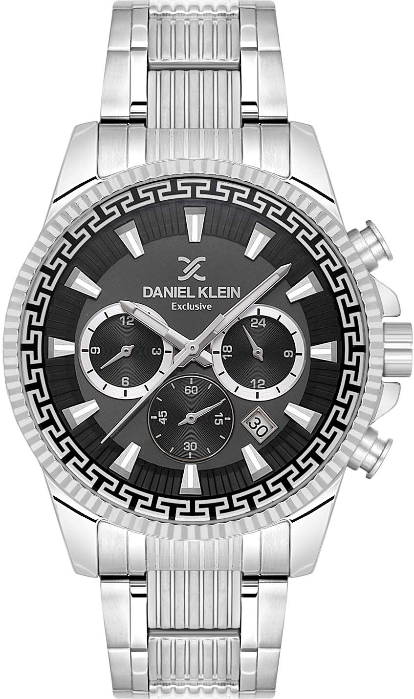Оригинальный мужской аксессуар станет визитной карточкой вашего элегантного образа. Мужские кварцевые часы. Круглый металлический корпус. Рифленый безель. 12-ти и 24-х часовой формат времени. Второй часовой пояс. Циферблат выполнен по технологии Sunray (солнечные лучи), украшен греческим узором и фирменным логотипом Daniel Klein. Метки в виде штрихов. Окошко даты находится между часовыми метками 4 и 5. Заводная головка с защитой. Стальной браслет с раскладывающейся застежкой.