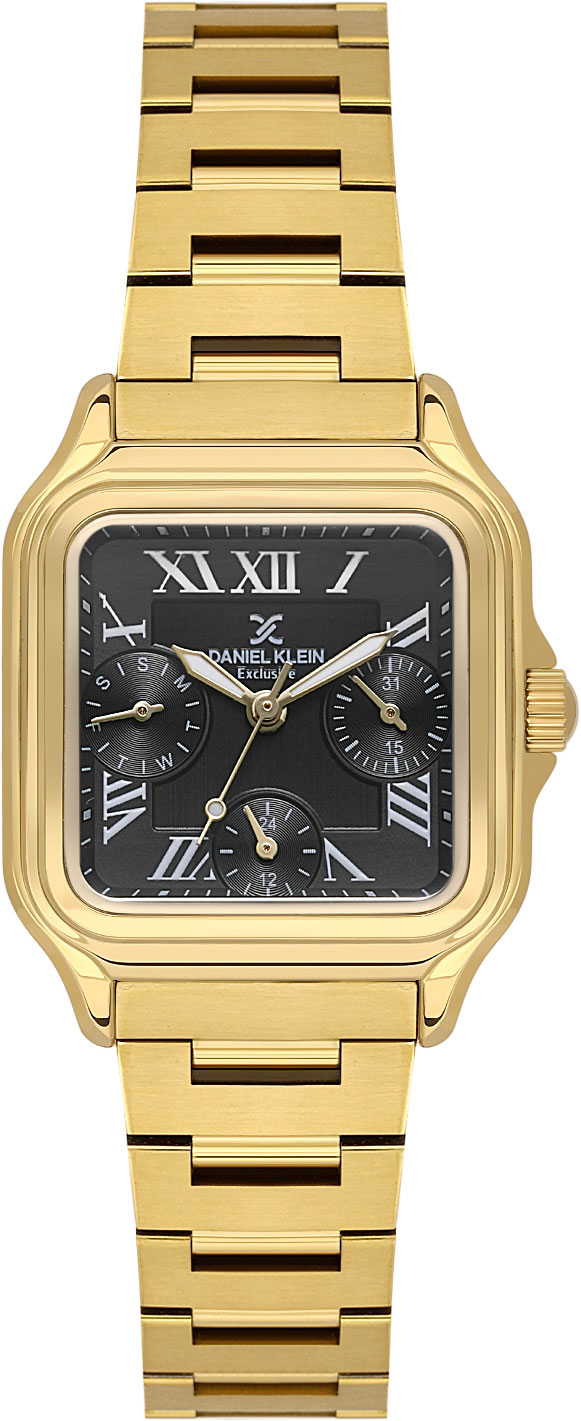 Женские наручные часы Exclusive. Квадратный металлический корпус c полированной поверхностью. Циферблат выполнен по технологии Sunray (солнечные лучи). Метки в виде римских цифр. Мечевидные стрелки в стиле Sword. На отдельных циферблатах отображаются 24-х часовой формат времени, дата и день недели. Рифленая заводная головка с защитой. Стальной браслет с раскладывающейся застежкой.