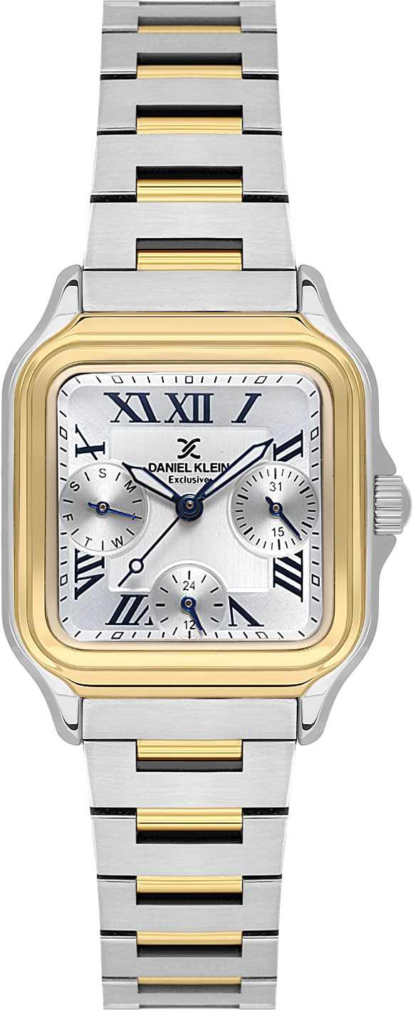 Женские наручные часы Exclusive. Квадратный металлический корпус c полированной поверхностью. Циферблат выполнен по технологии Sunray (солнечные лучи). Метки в виде римских цифр. Мечевидные стрелки в стиле Sword. На отдельных циферблатах отображаются 24-х часовой формат времени, дата и день недели. Рифленая заводная головка с защитой. Стальной браслет с раскладывающейся застежкой.